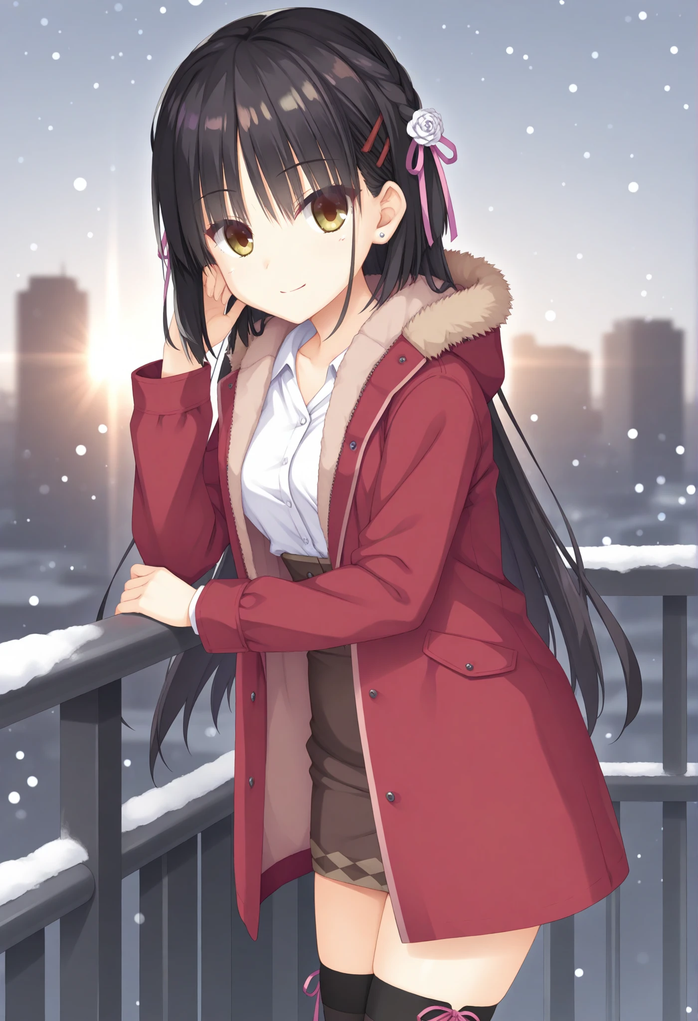 long hair,side braid,hair ribbon,pink ribbon,hair flower,white flower,red hairclip,casual,black thighhighs,white shirt,red coat,open coat,fur-trimmed coat,brown skirt,miniskirt,long sleeves,stud earrings,high-waist skirt,hooded coat,collared shirt,dress shirt,pencil skirt,thigh ribbon,red ribbon,hood down,女仆 (maid)