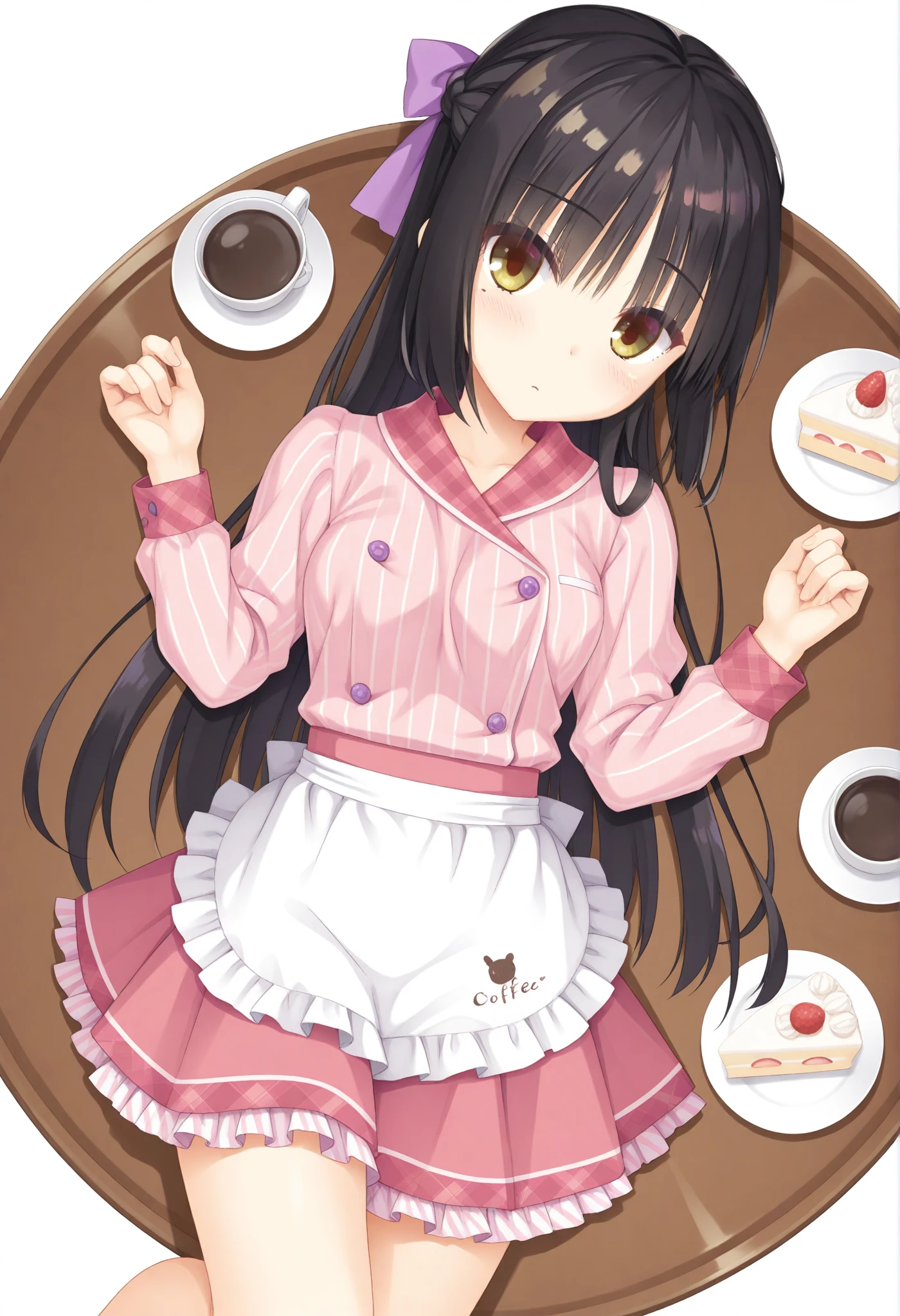 long hair,braid,hair bow,purple bow,waitress,waist apron,white apron,pleated skirt,frilled apron,miniskirt,frilled skirt,pink skirt,pinstripe pattern,pink shirt,double-breasted,vertical-striped shirt,旗袍 (china dress)