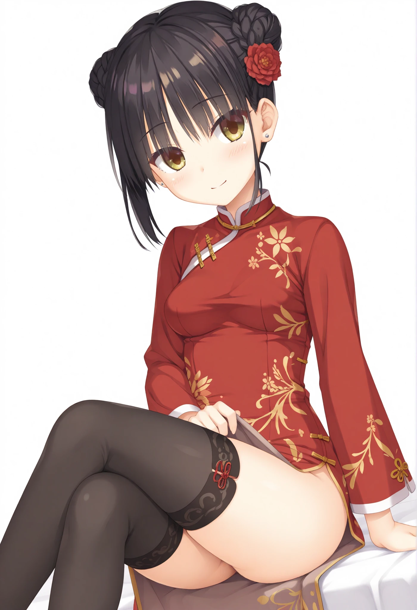 short hair,braided bun,double bun,hair flower,red flower,china dress,red dress,black thighhighs,long sleeves,side slit,print dress,stud earrings,旗袍 + 大衣 (china dress + coat)