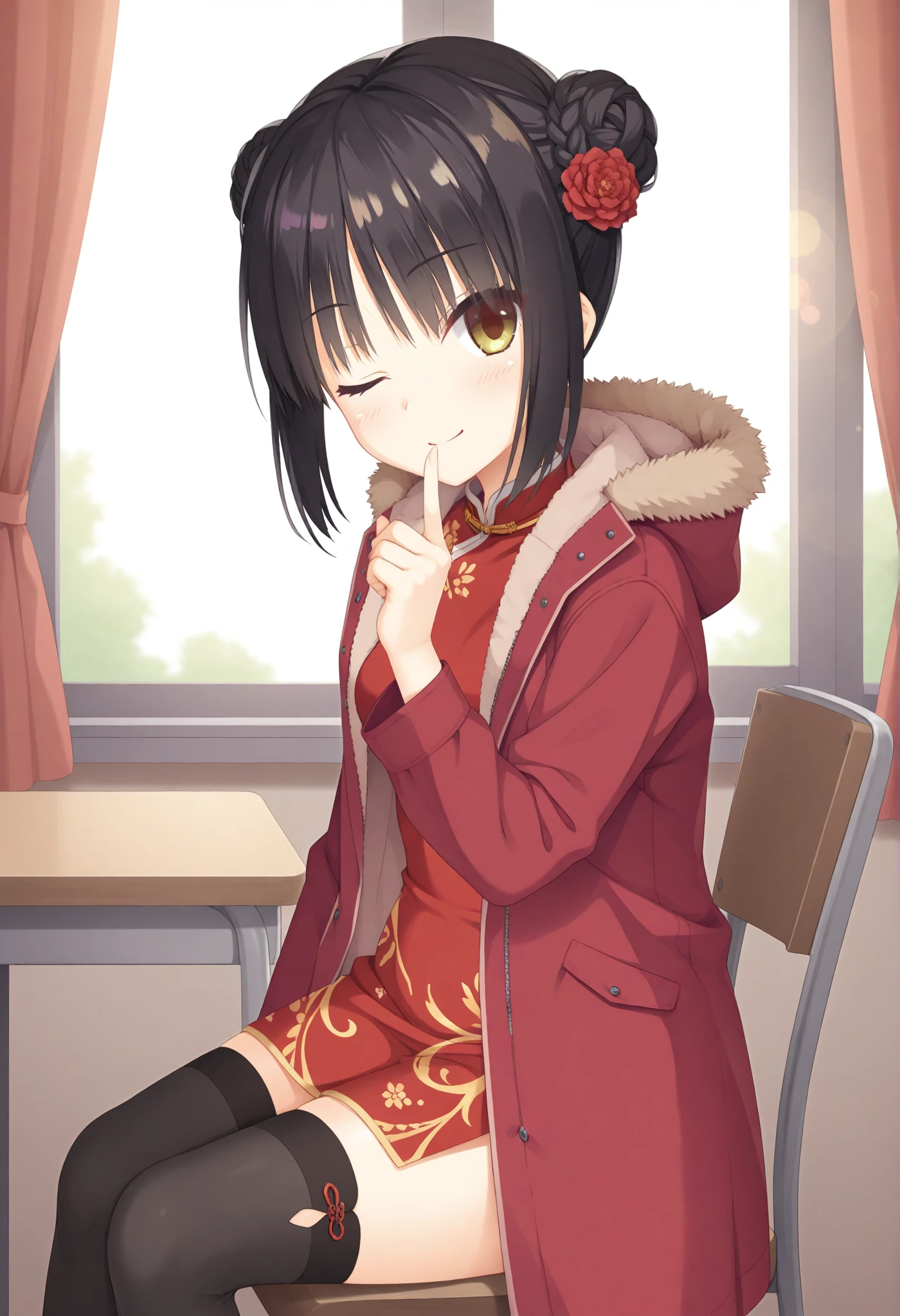short hair,double bun,braided bun,hair flower,red flower,hooded coat,china dress,red dress,long sleeves,open coat,black thighhighs,red coat,fur-trimmed coat,hood down,————————————