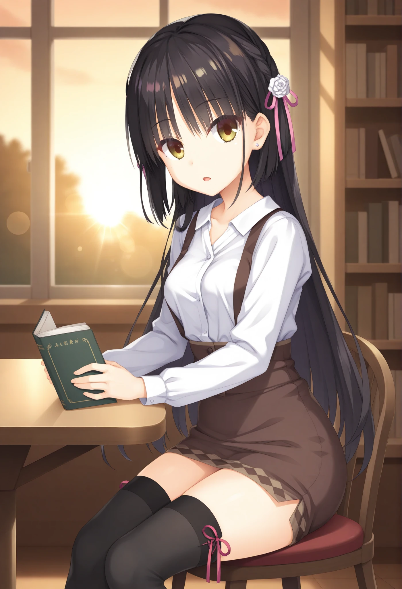 long hair,side braid,hair ribbon,pink ribbon,hair flower,white flower,casual,black thighhighs,white shirt,suspender skirt,brown skirt,long sleeves,miniskirt,pencil skirt,collared shirt,dress shirt,high-waist skirt,thigh ribbon,red ribbon,stud earrings,私服 + 大衣 (casual + coat)