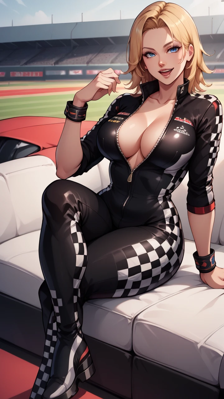 "TinaRQ, blonde hair, blue eyes, black biker clothes, unzipped, checkered clothes, large breasts, bracelet" for her race queen costume.