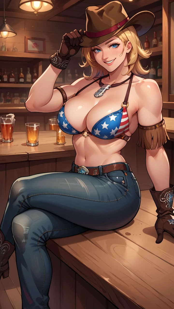 "TinaDOA, blonde hair, blue eyes, medium hair, american flag bikini, leather gloves, horseshoe necklace, jeans, cowboy hat, large breasts, armlet" for her american flag bikini costume.