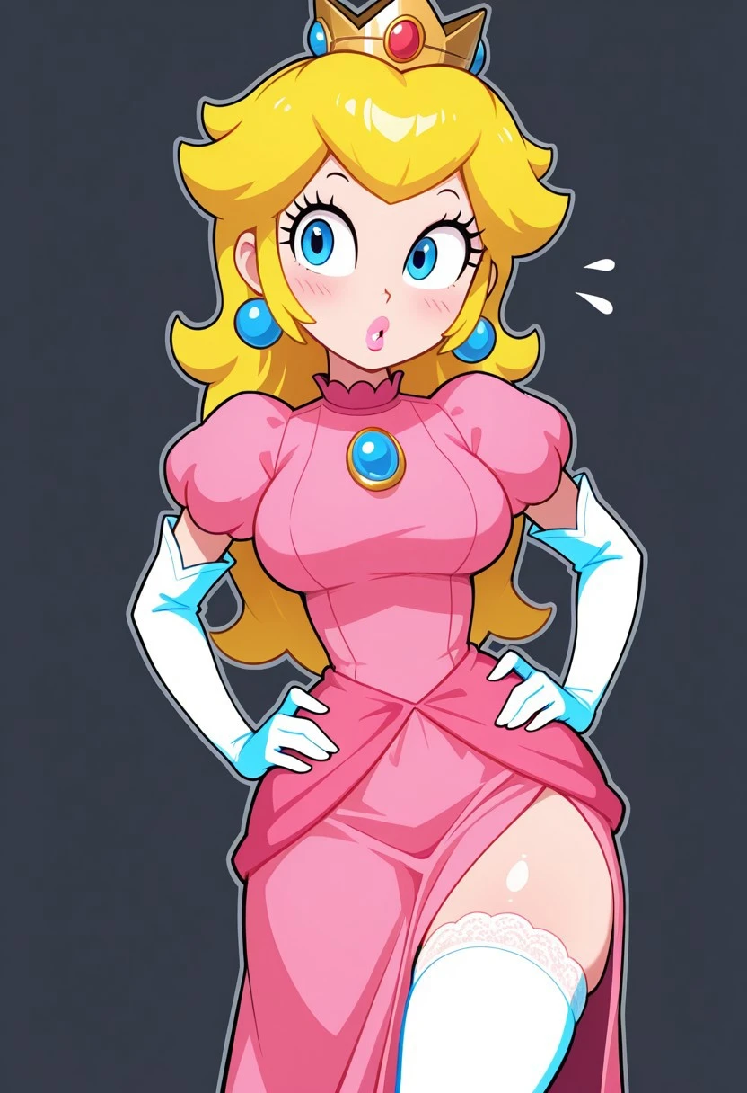 1girl, Princess Peach, medium breast, pink dress, blonde hair, long hair, gloves, elbow gloves, white gloves, thighhighs, earrings, crown