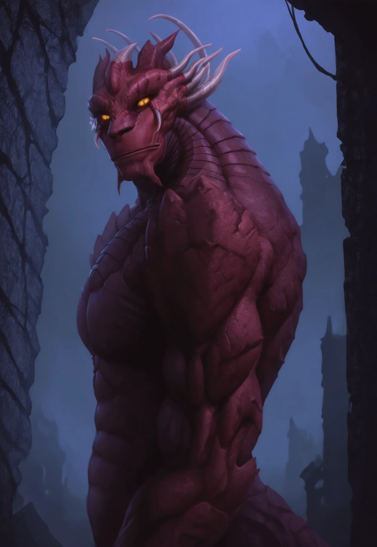 Belloc, Monster, kaiju, giant, sharp teeth, claws, tail, horns, yellow eyes, glowing eyes, Purple scales, long neck, Chitin armor,