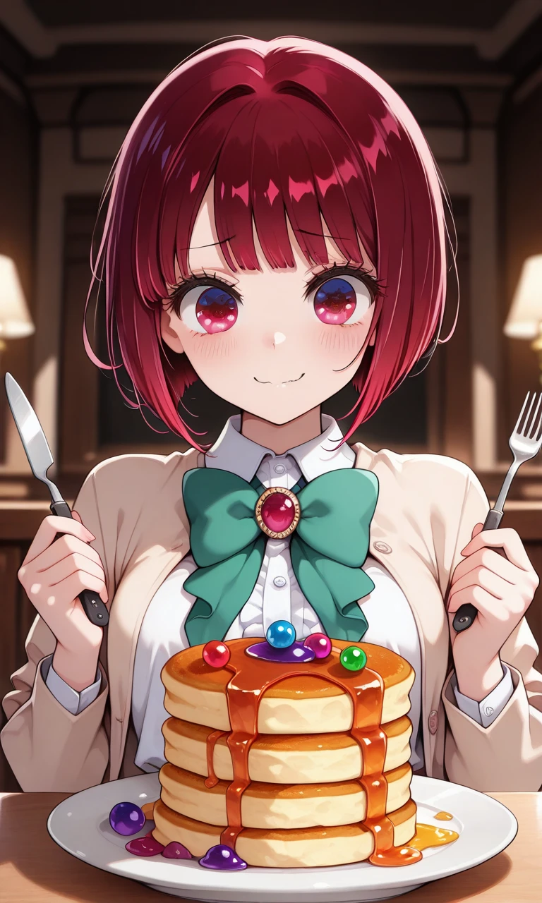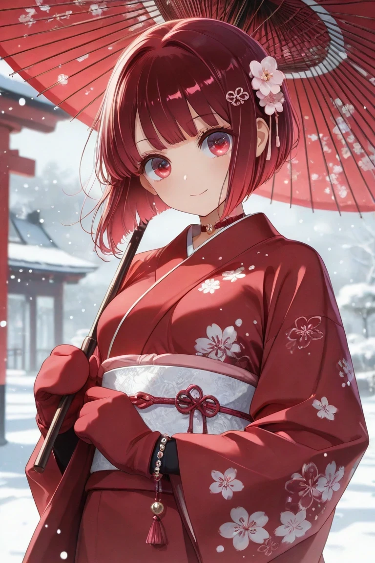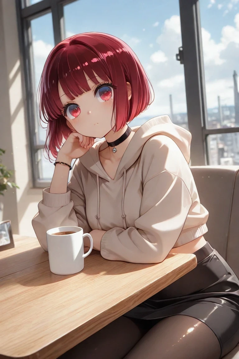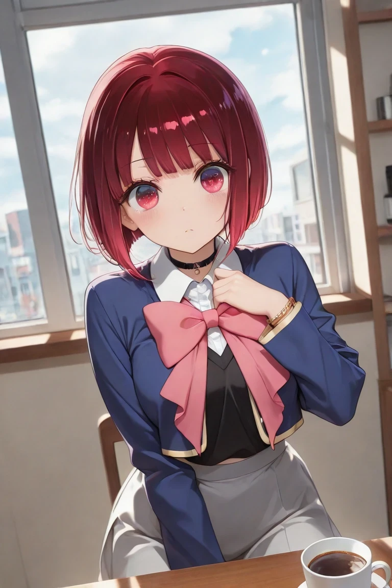 Arima_Kana, red_hair, bobcut, red_eyes, youtou_high_school_uniform, big_pink_bow, light_grey_skirt, blue_jacket, cropped_jacket, open_jacket, black_shirt, long_sleeves, white_collar_shirt