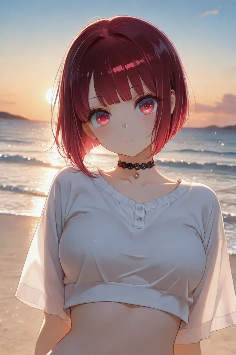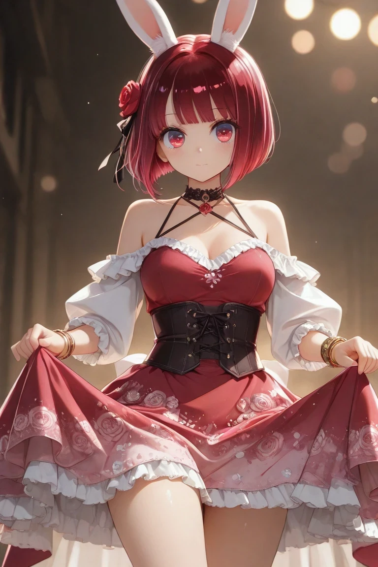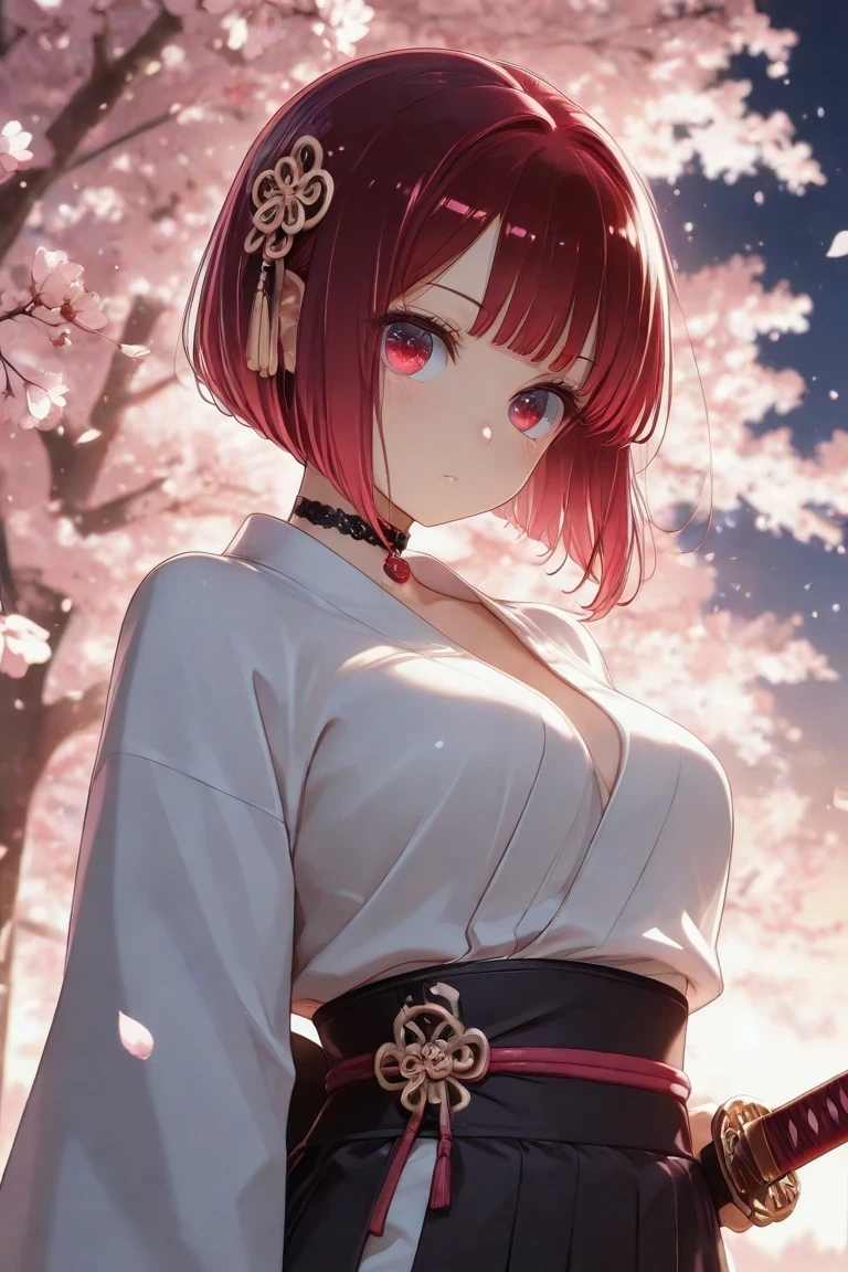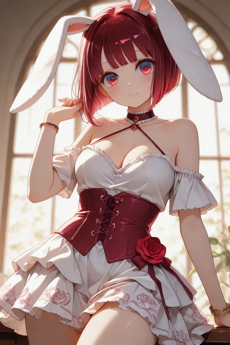 Arima_Kana, red_hair, bobcut, red_eyes, youtou_high_school_uniform, big_pink_bow, light_grey_skirt, blue_jacket, cropped_jacket, open_jacket, black_shirt, long_sleeves, white_collar_shirt