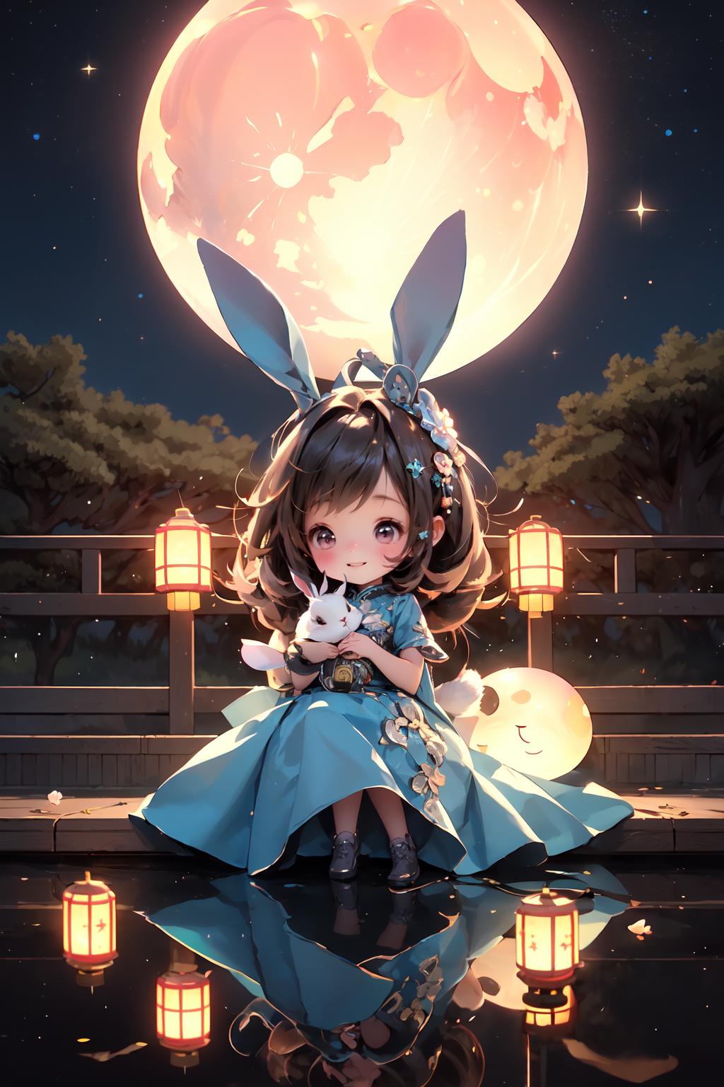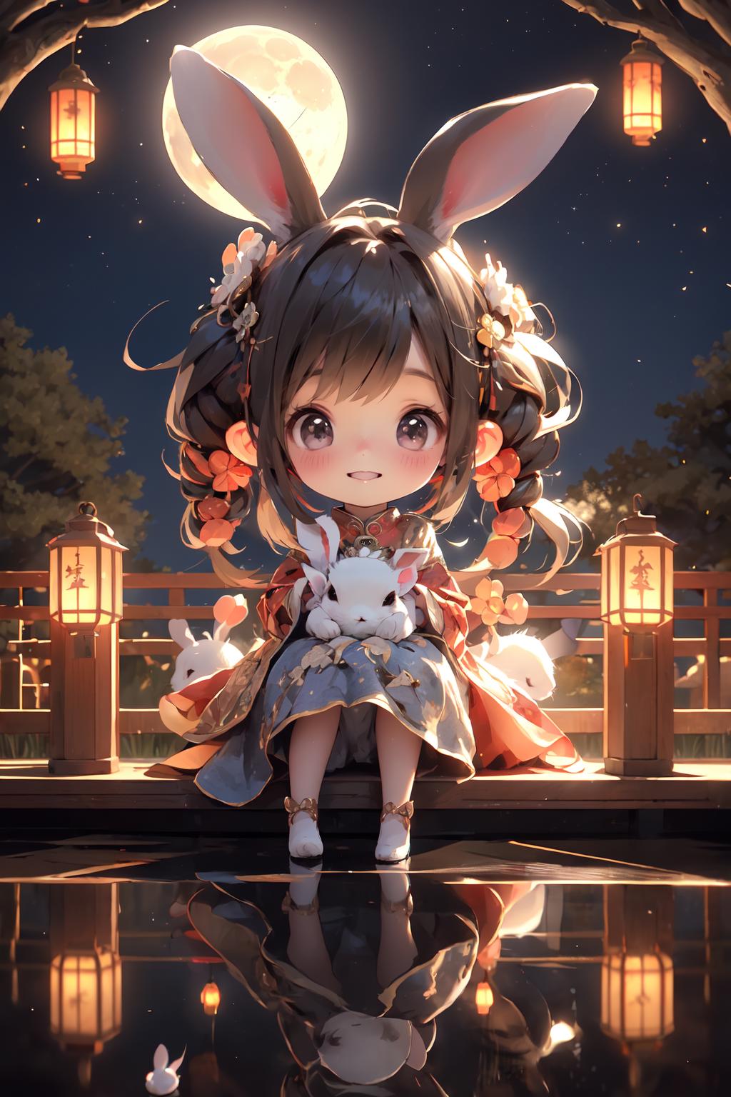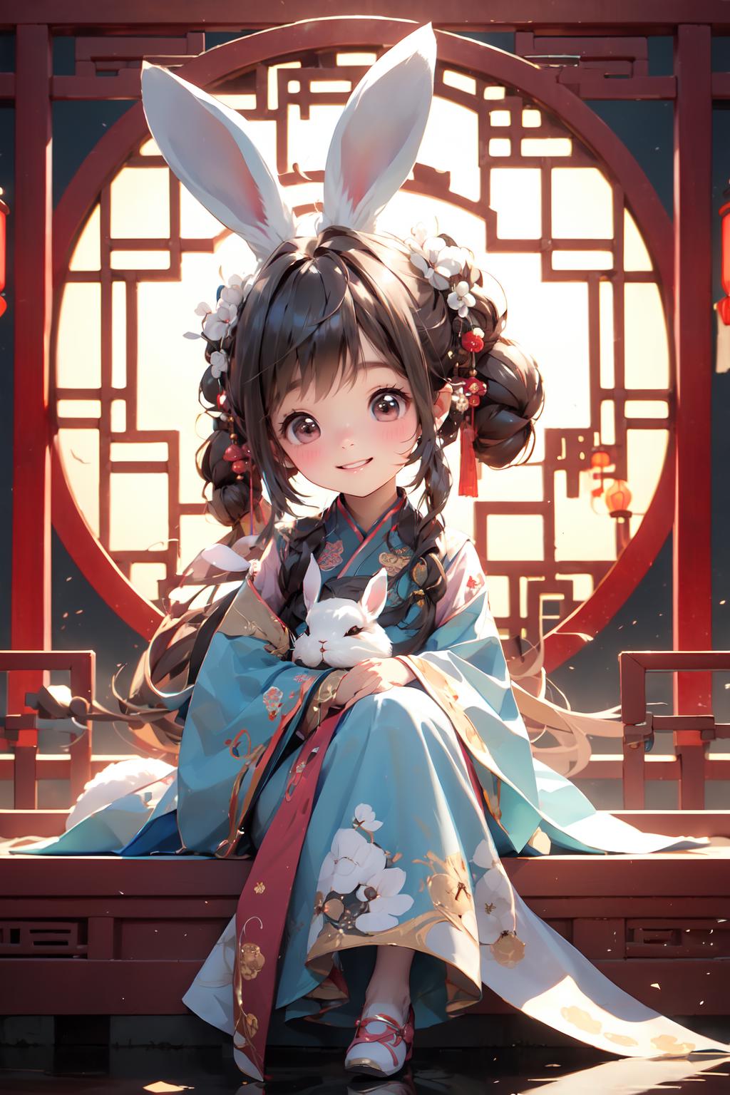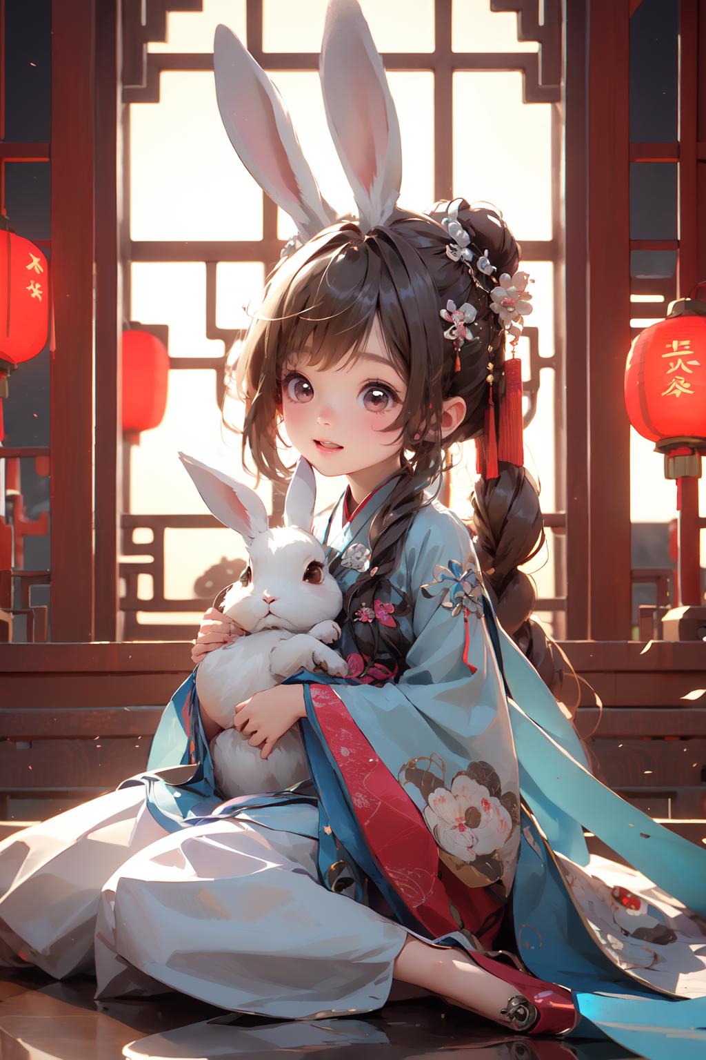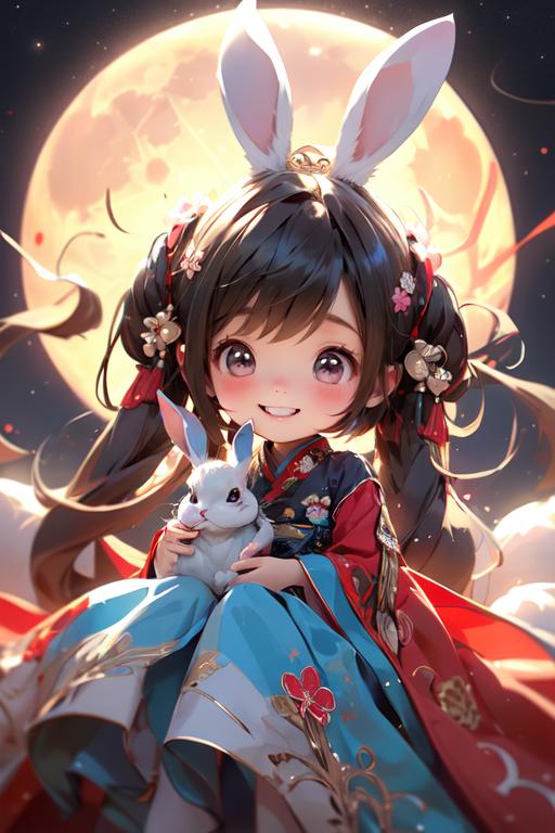 此lora为中秋节服饰系列的玉兔装,上架两个版本,一个版本是偏3D萌娃的儿童版,一个是偏写实女生的版本