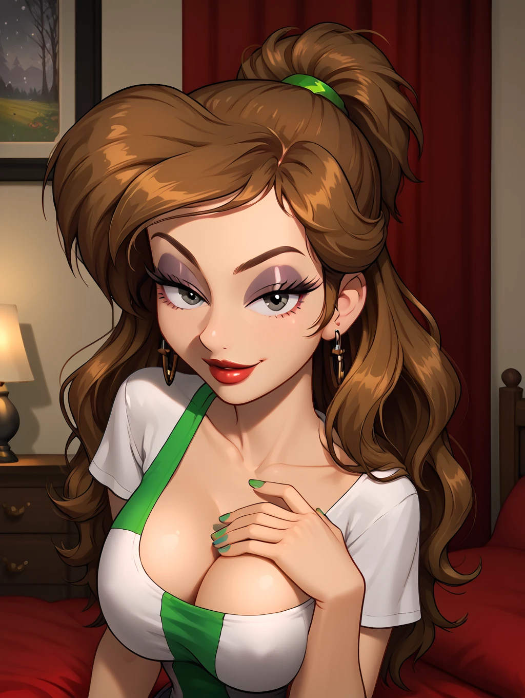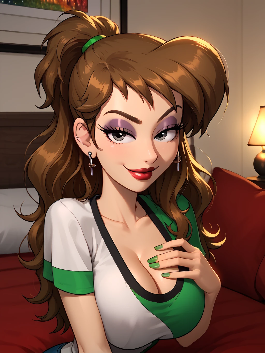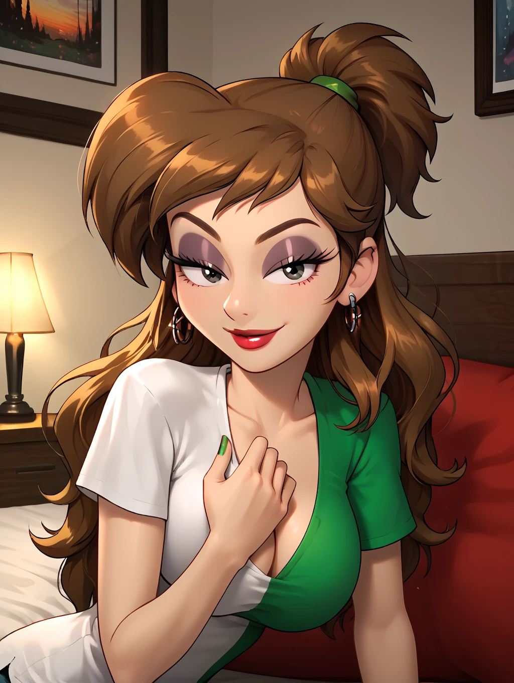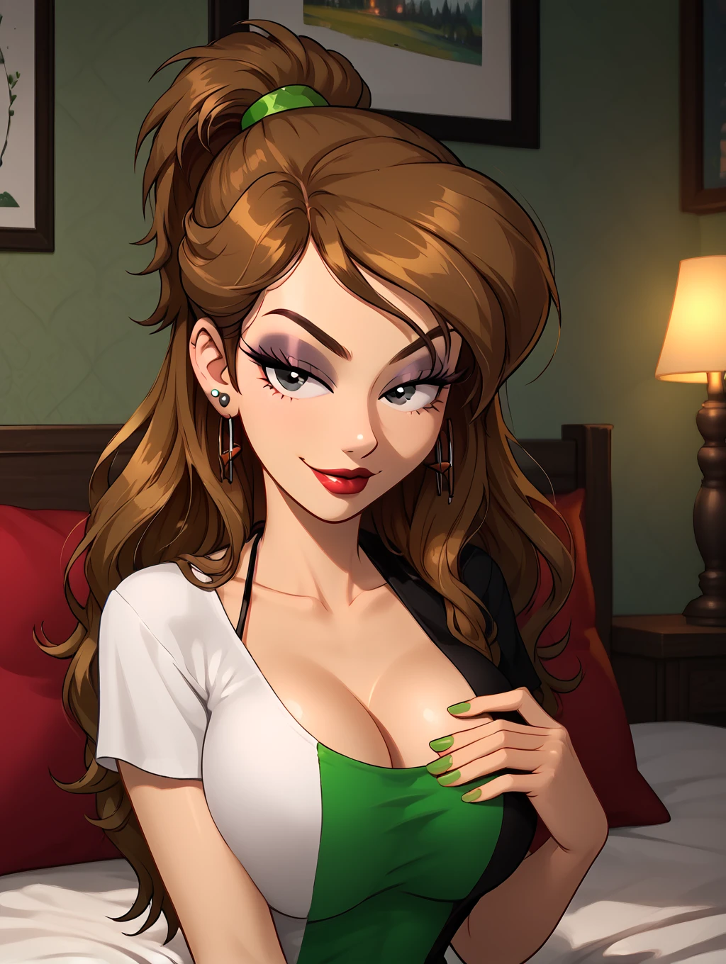 casual_outfit, two-tone shirt,green hairband,green and white shirt, plunging neckline, tight shirt,