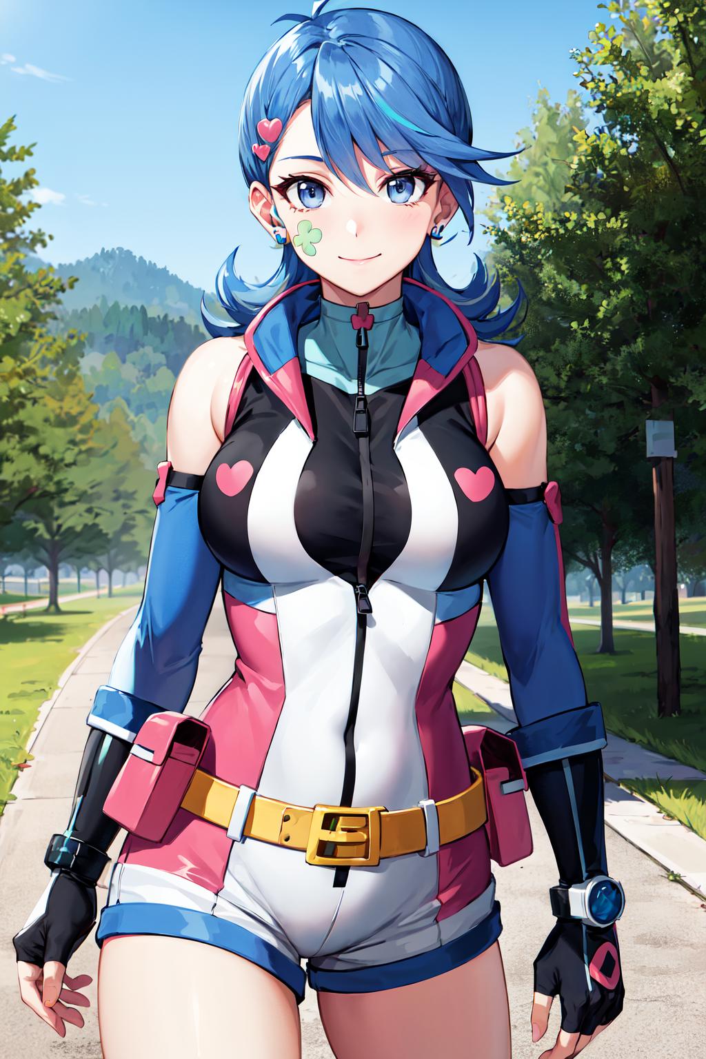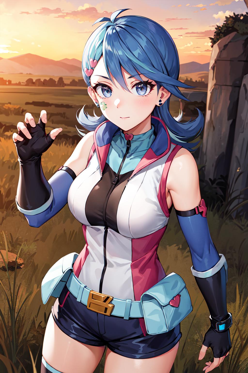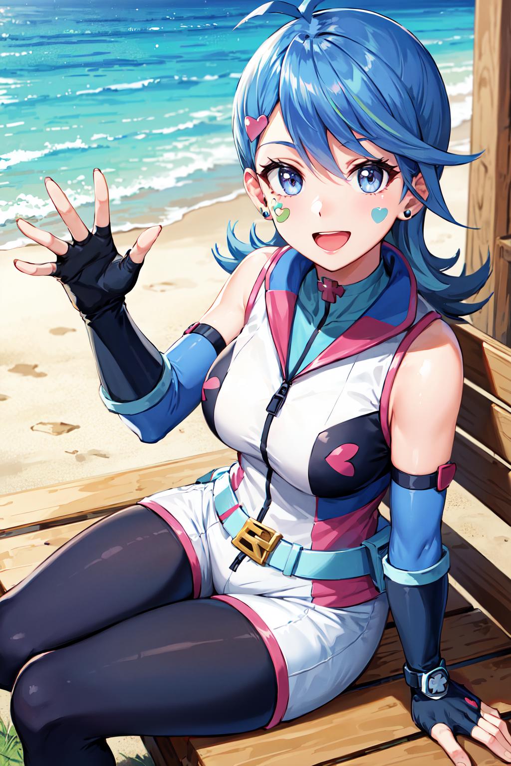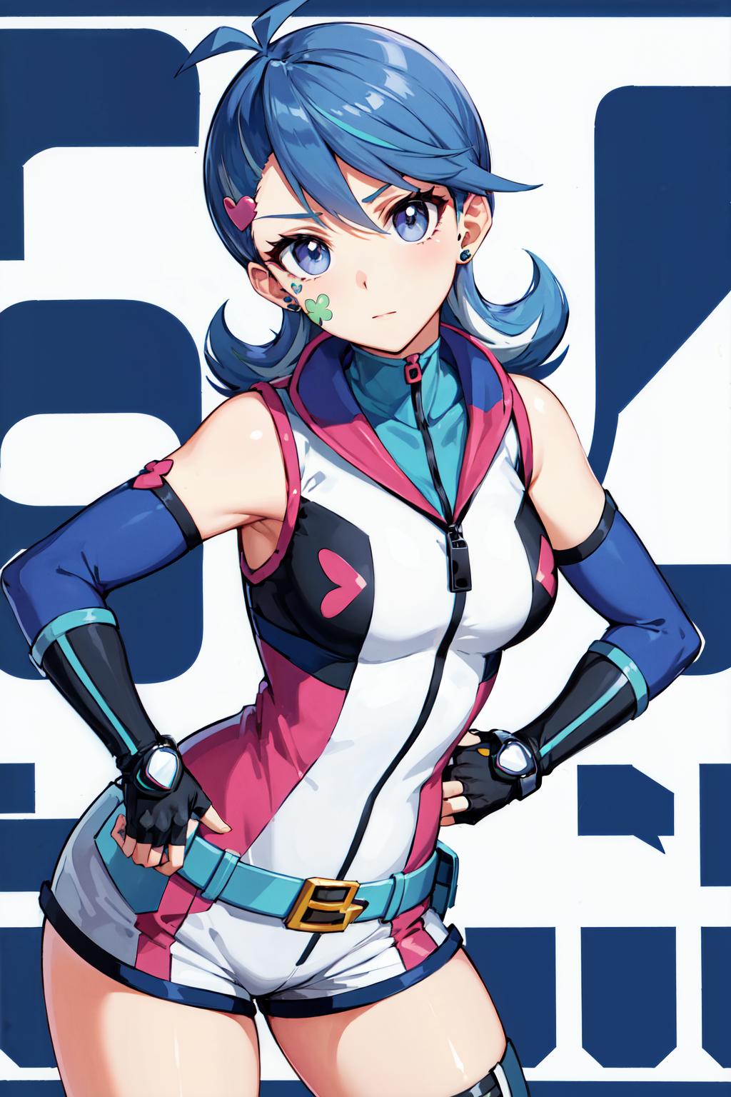 hmbg, medium hair, multicolored hair, antenna hair, hair ornament, facial tattoo, heart earrings, sleeveless jacket, sleeveless, detached sleeves, fingerless gloves, belt, white shorts