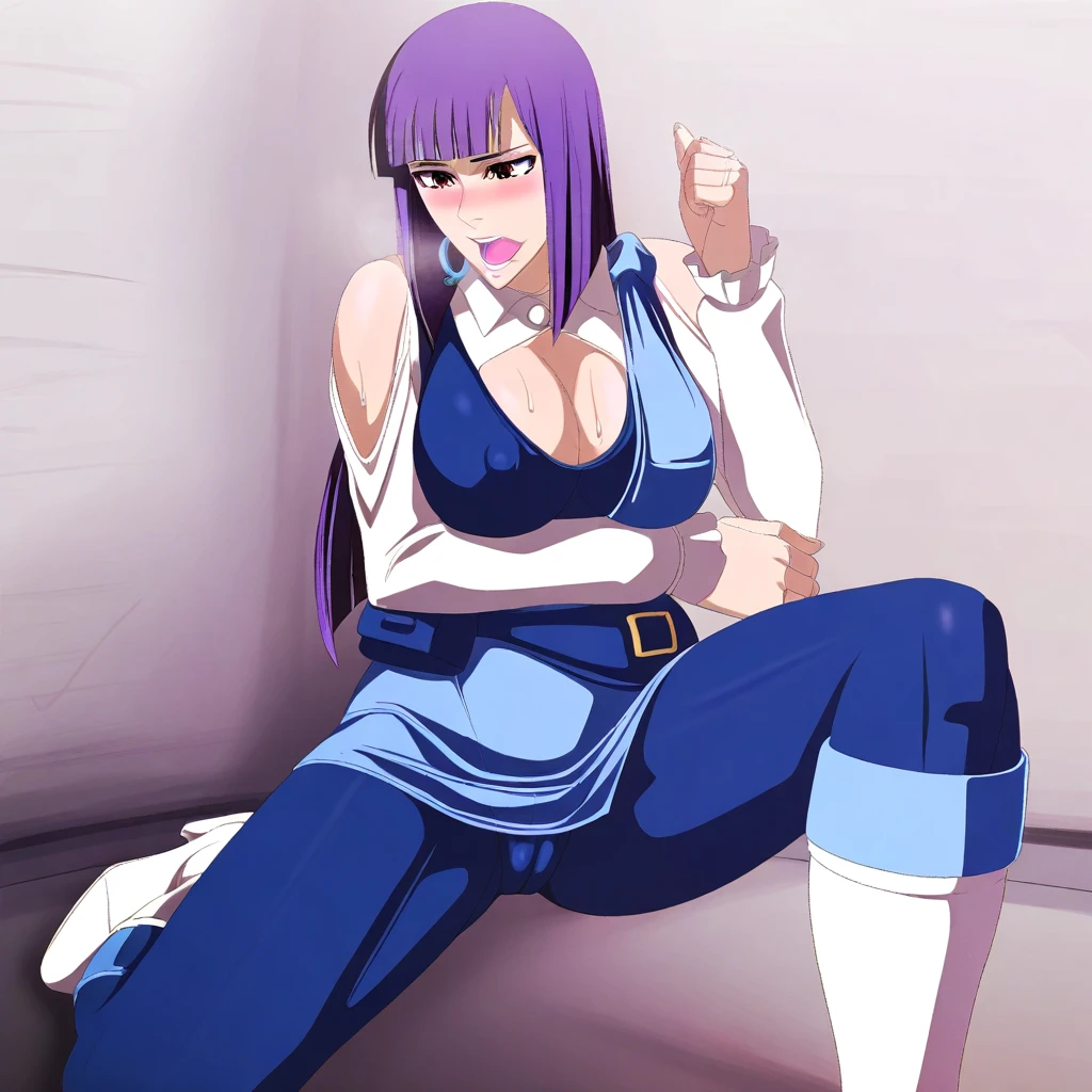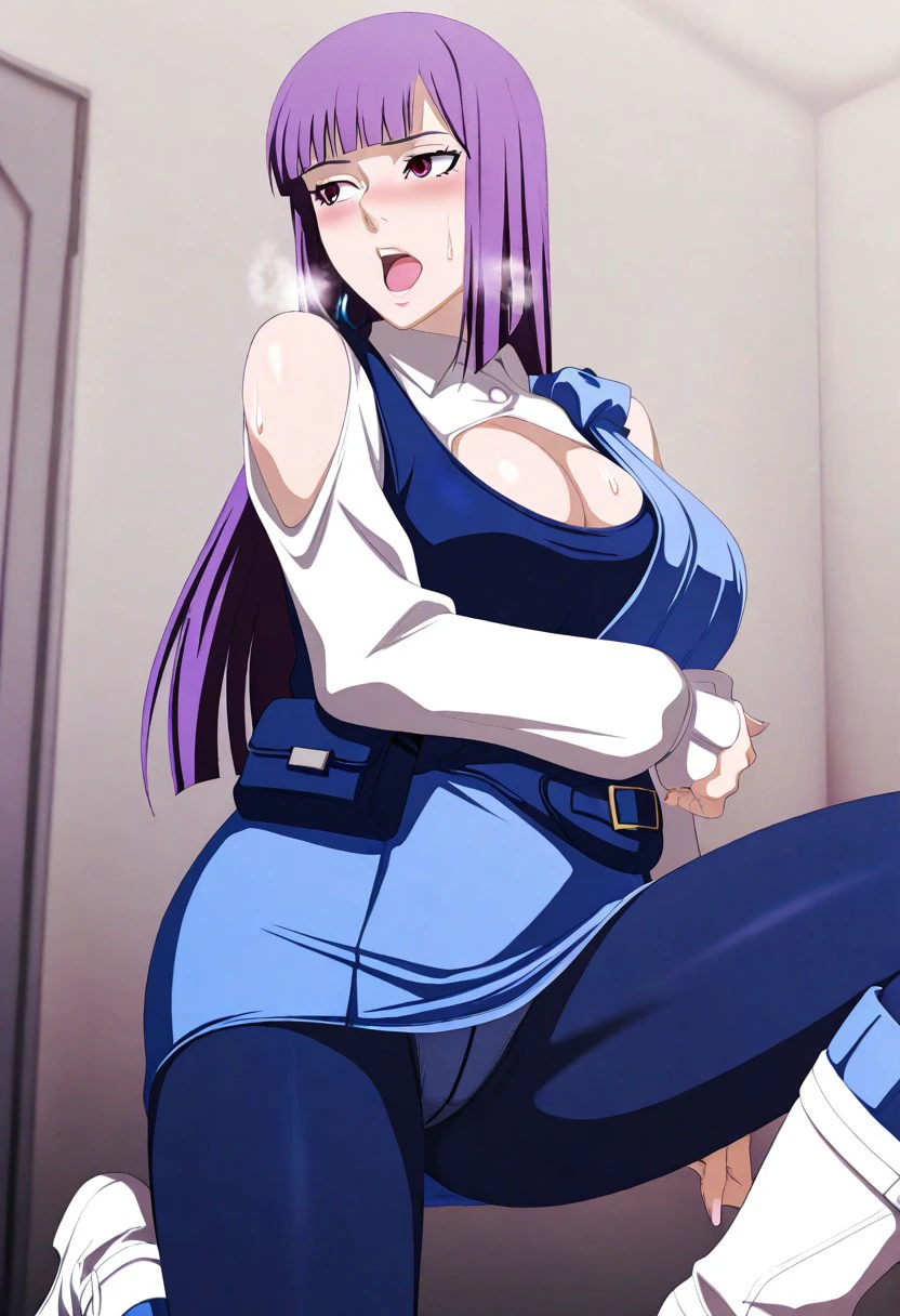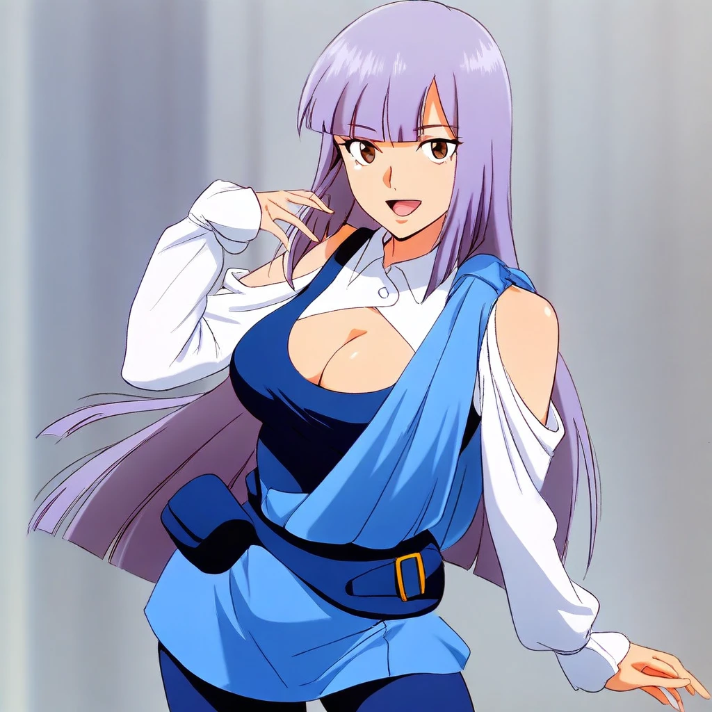 Outfit: blue tanktop, cleavage cutout, white sleeves, bare shoulder, light blue short dress, fanny pack, blue pantyhose, light blue legwarmers, white boots