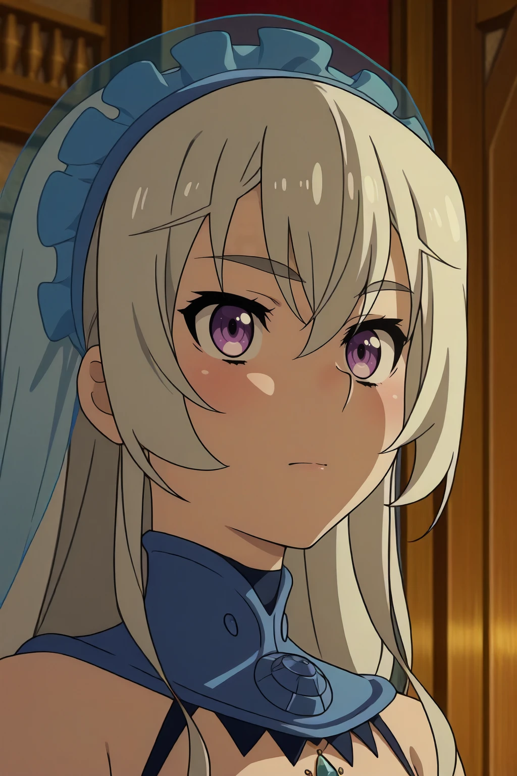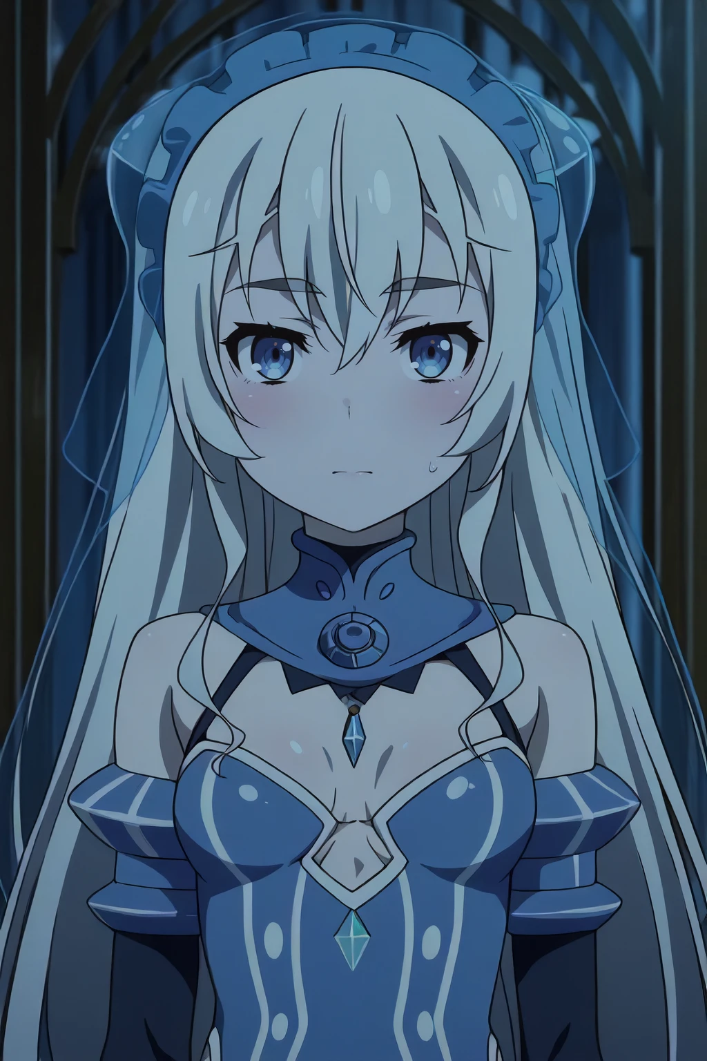 blue dress, bridal veil, elbow gloves, hairband, long hair, no panties, socks, thick eyebrows