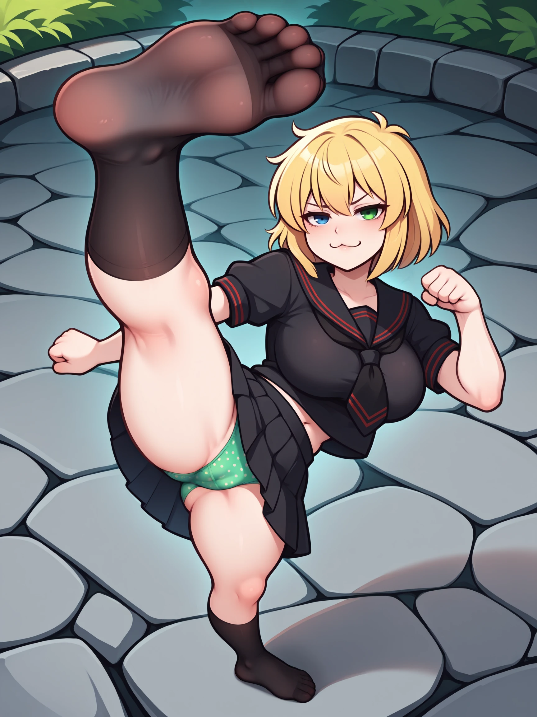 Trigger Words for school outfit is "hebijo suit, black serafuku, black skirt, crop top". Useful tags: "green bra, polka dot bra, green panties, polka dot panties" for her classical panties.