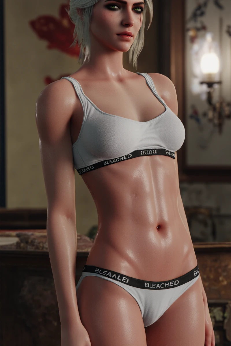 Ask Flux for 'woman/character wearing BleachedWear' and maybe 'wearing underwear that says "Bleached" on it'.