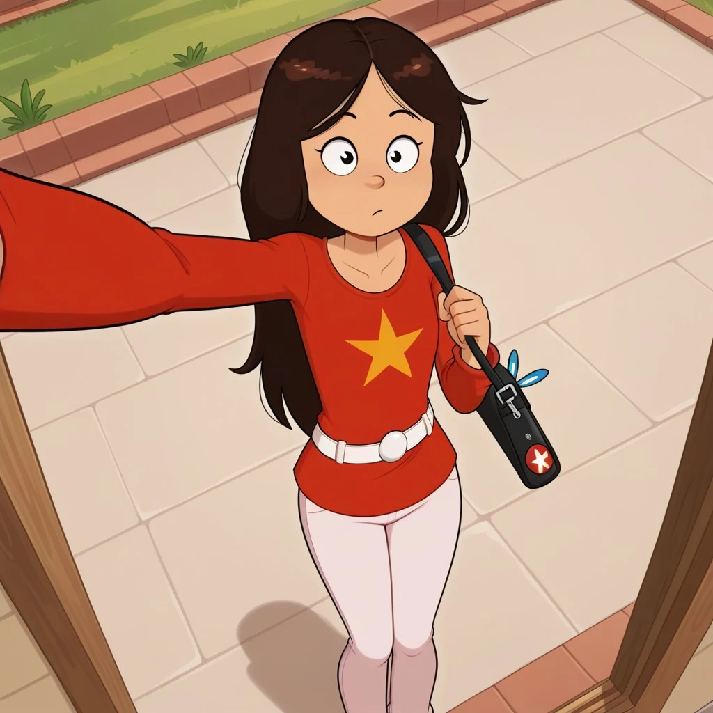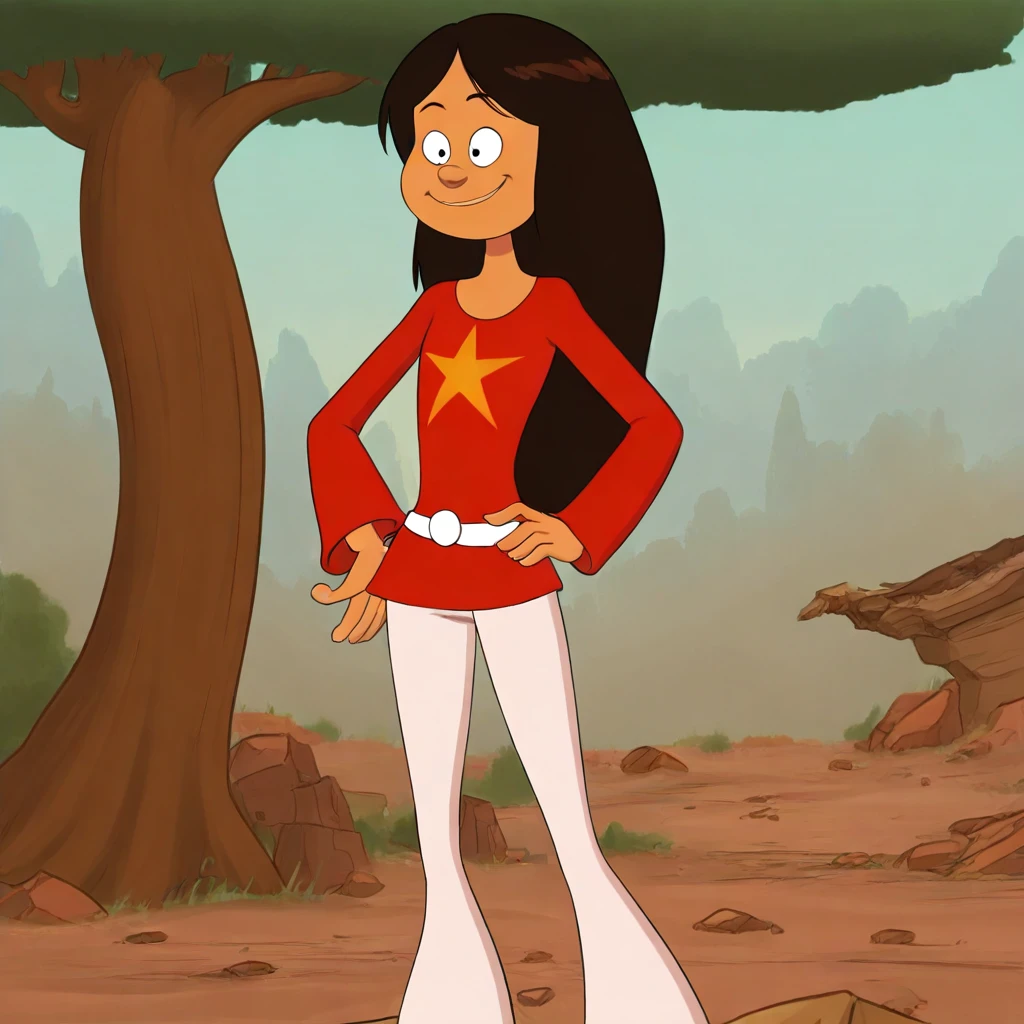 wendy_ts, brown hair, long hair, star_shirt, belt, pants