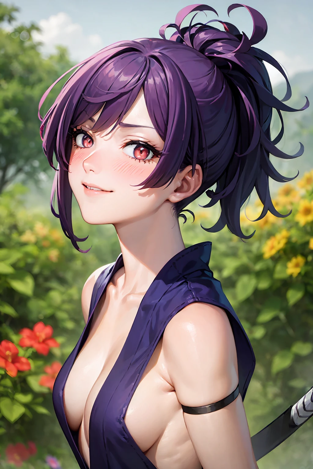 Trigger word: yuzuriha_(jigokuraku), purple hair, brown eyes, cleavage, small breasts, topknot