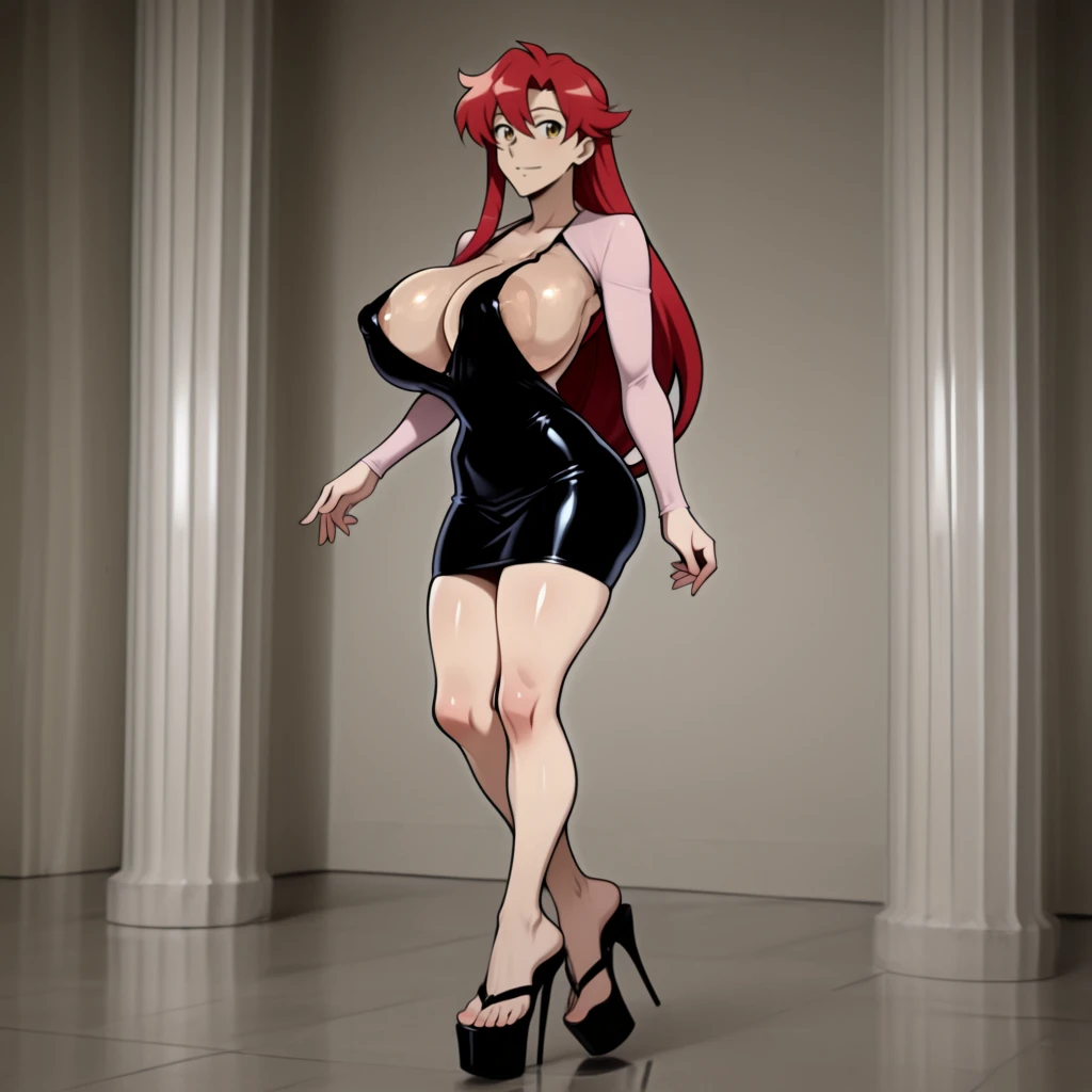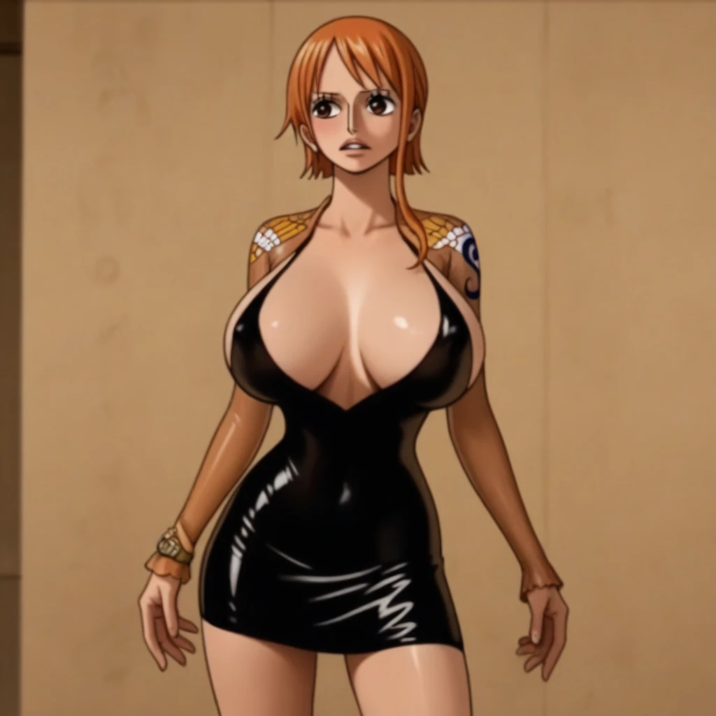 black dress, shiny dress, short dress, dress, halter dress, skin tight, long sleeves, plunging neckline,
