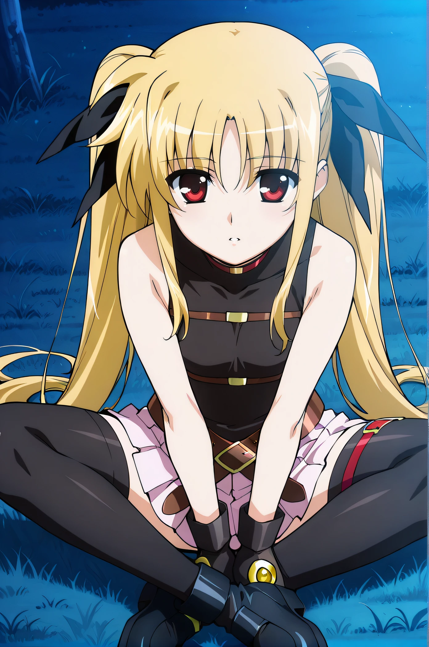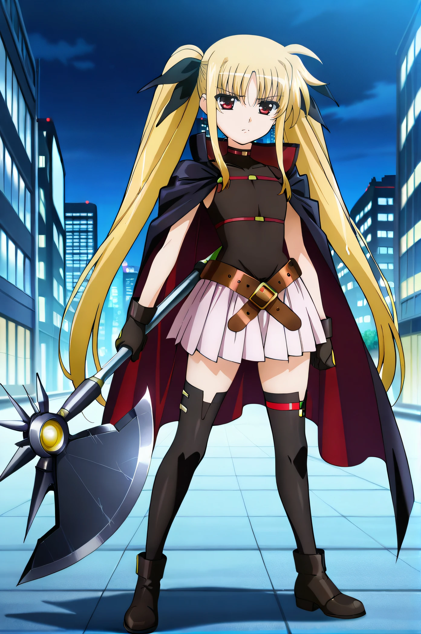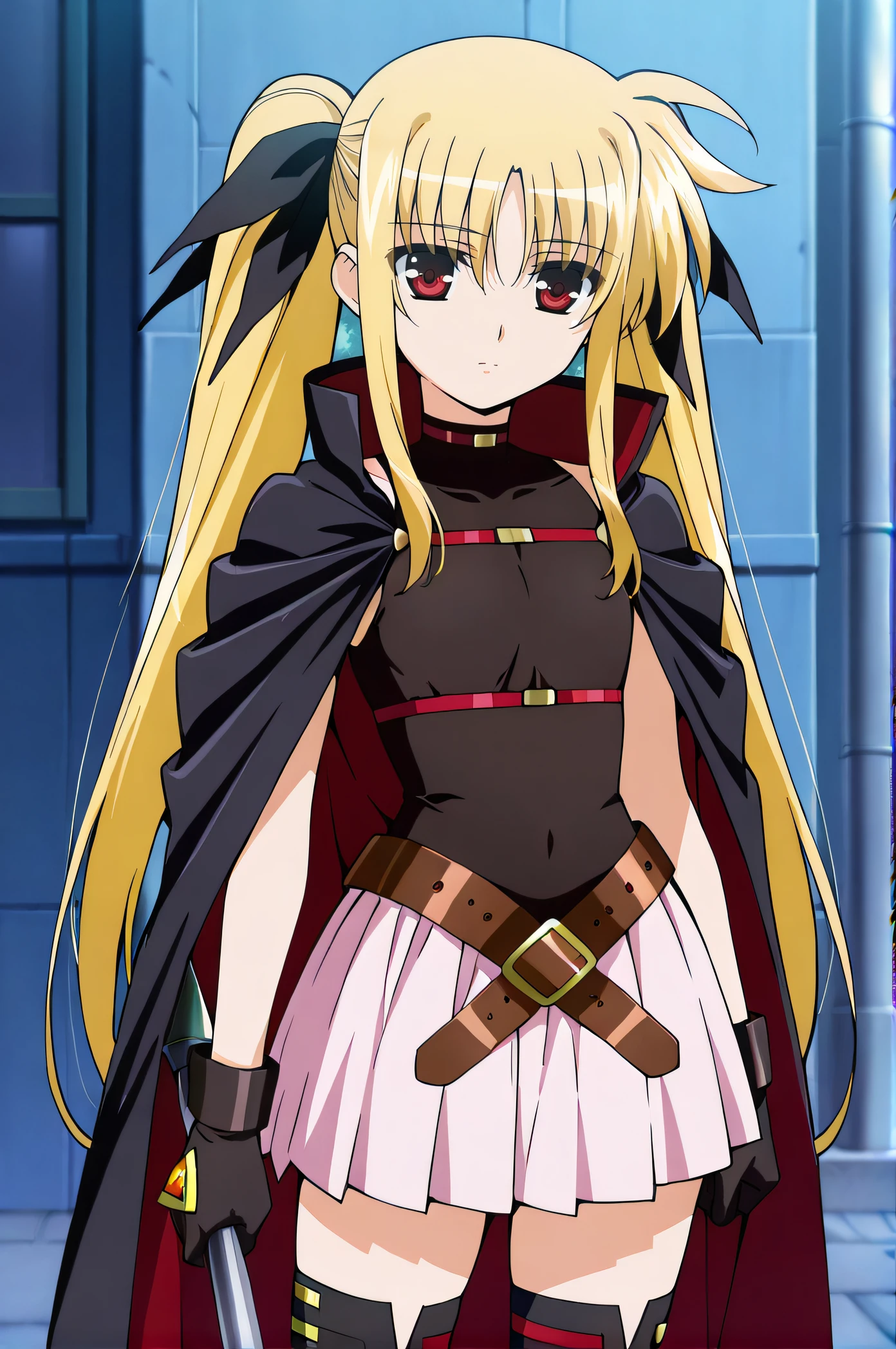 fate, blonde hair, very long hair, twintails, red eyes, magical girl, black shirt, sleeveless, pink pleated skirt, black gloves, red buckle, brown belts, cape, black thighhighs, black shoes
