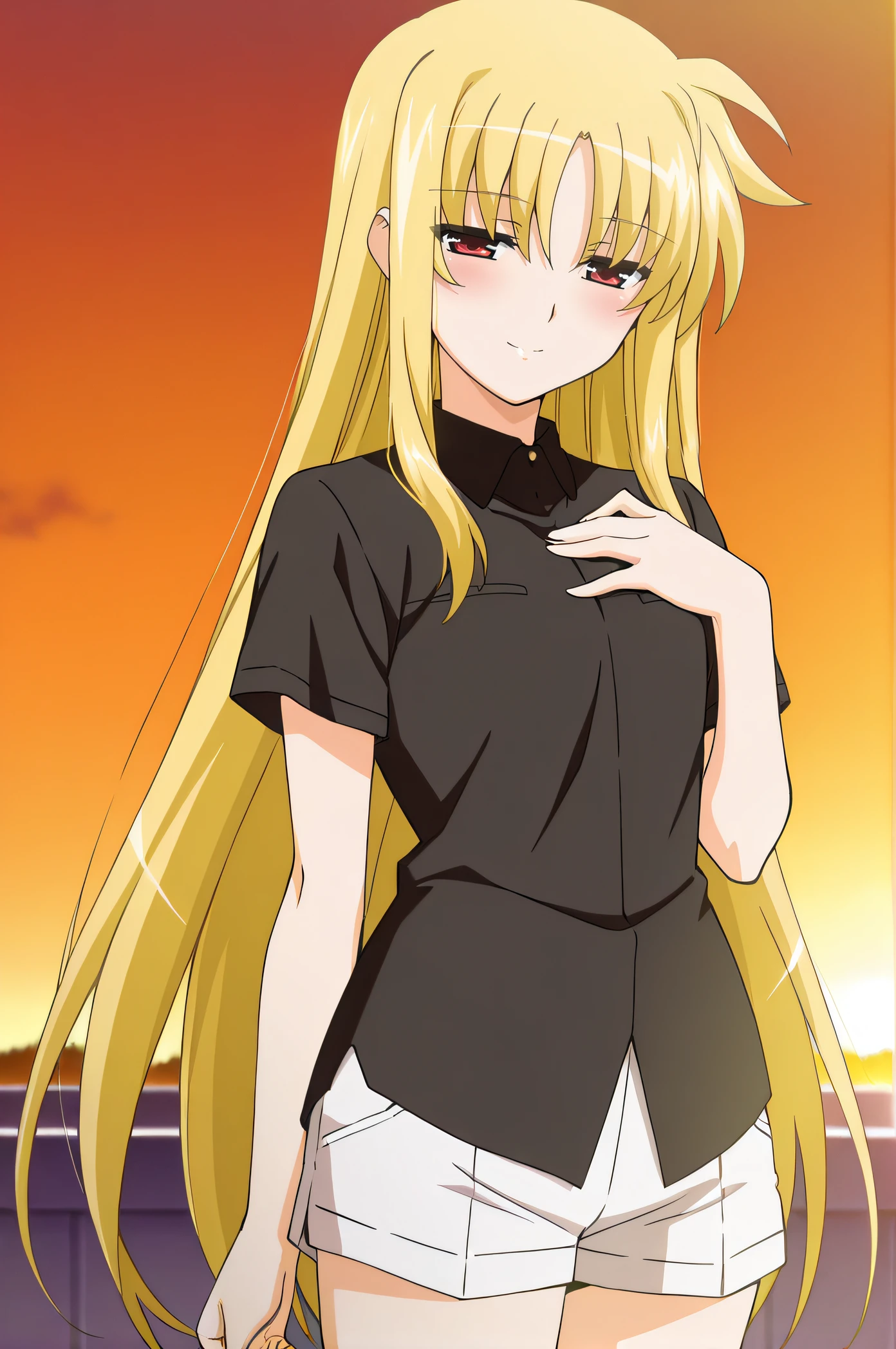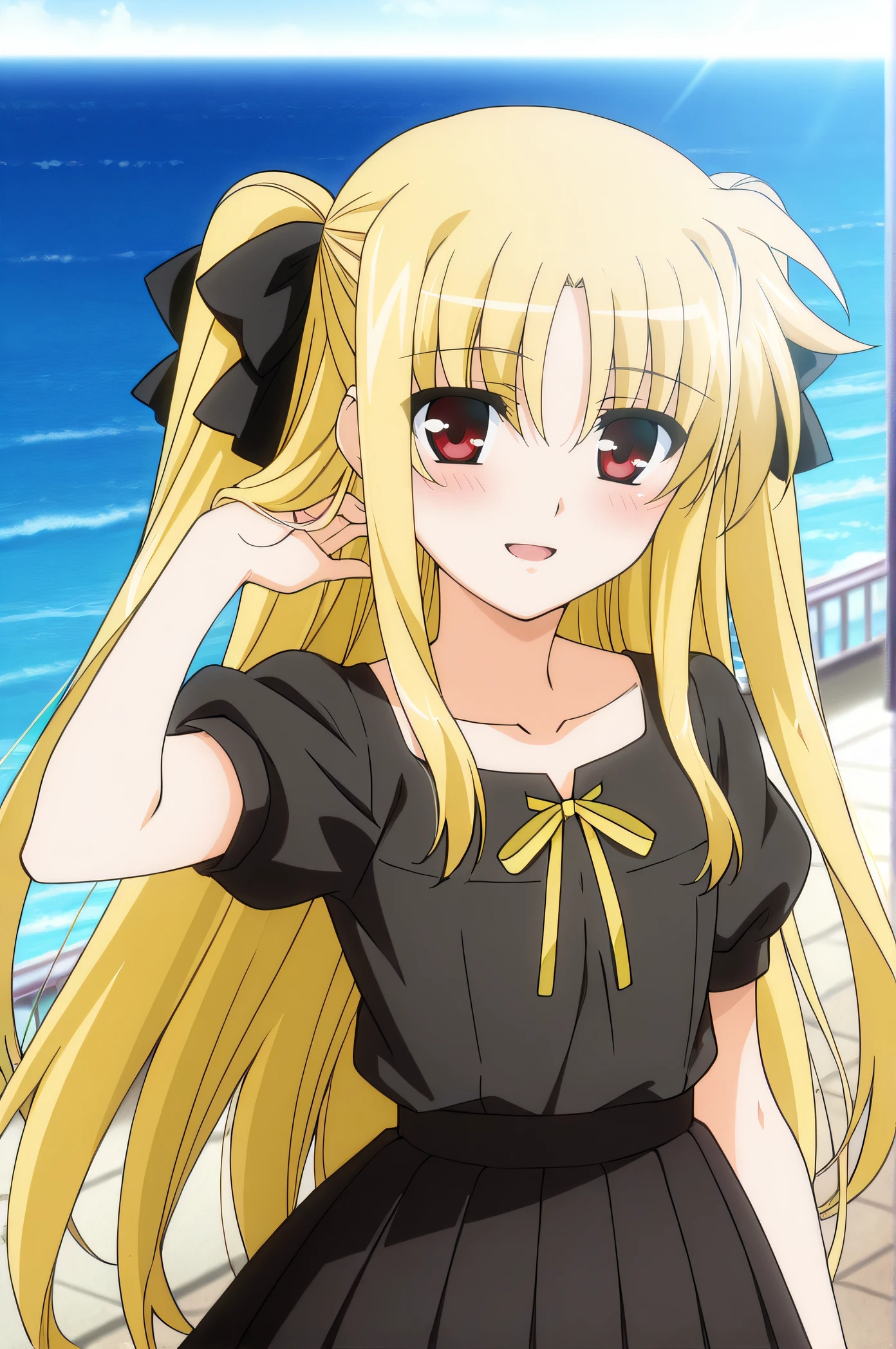 fate, blonde hair, very long hair, two side up, red eyes, black shirt, short sleeves, puffy sleeves, collarbone, yellow ribbons, black pleated skirt