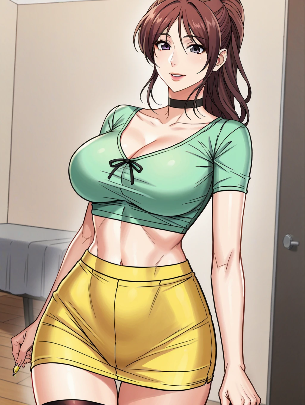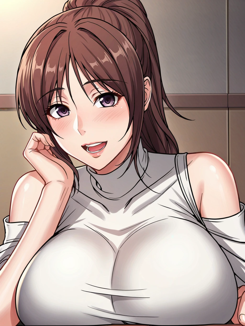 daye,brown hair,purple eyes, long hair,ponytail, large breasts