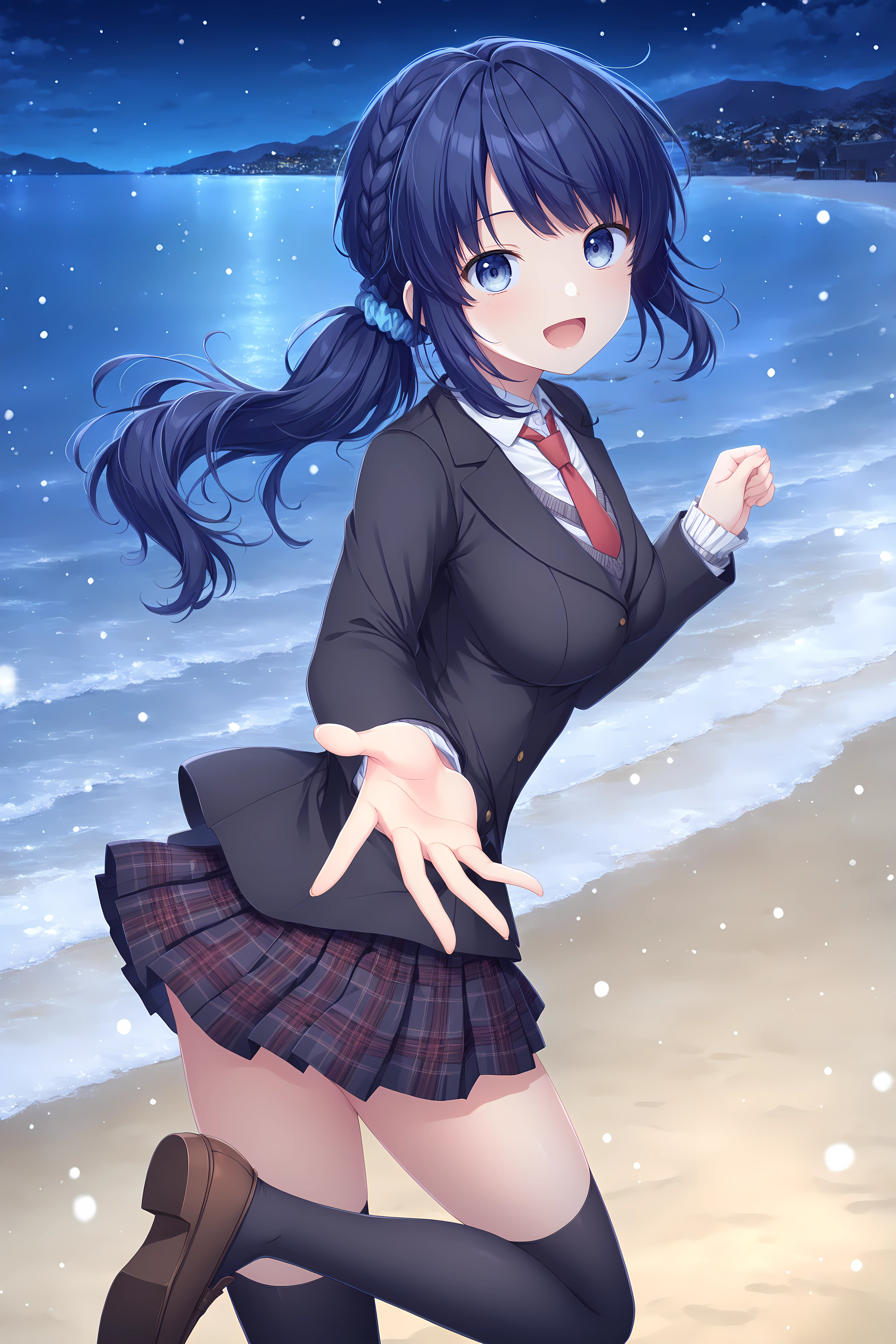 Jacket + Uniform: Jacket Kiriha,thighhighs,red necktie,brown footwear,necktie,jacket,pleated skirt,black thighhighs,school uniform,black jacket,white shirt,loafers,shoes,shirt,collared shirt,plaid skirt,miniskirt,long sleeves,