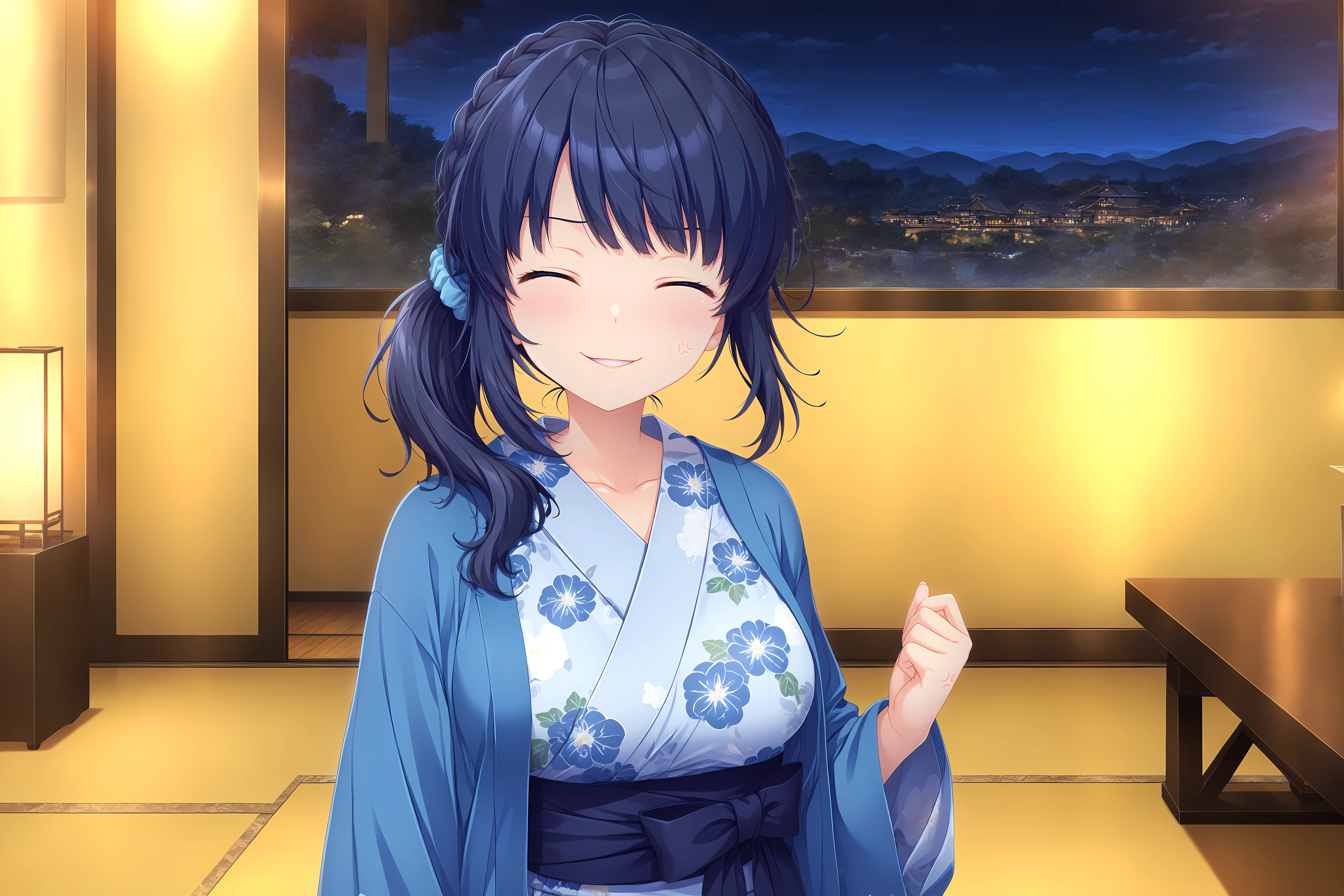 Yukata: Yukata Kiriha,kimono,japanese clothes,barefoot,yukata,side ponytail,sash,hair over shoulder,blue kimono,long sleeves,obi,print kimono,haori,blue haori,