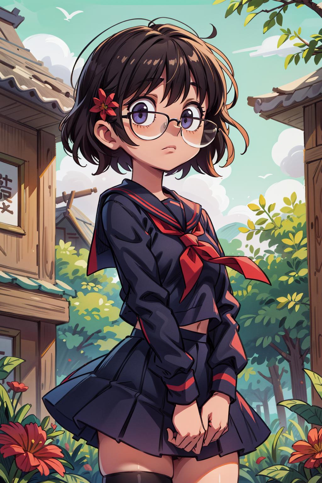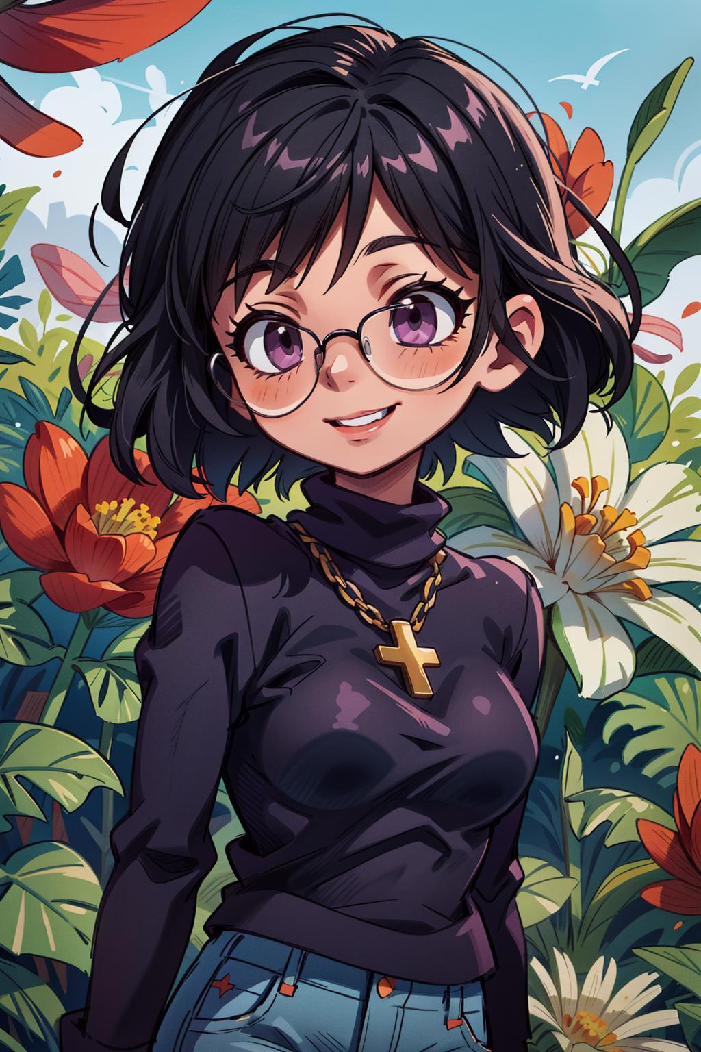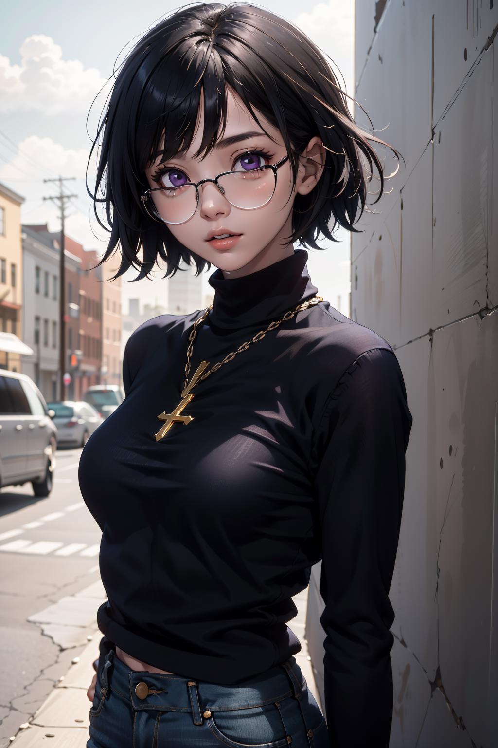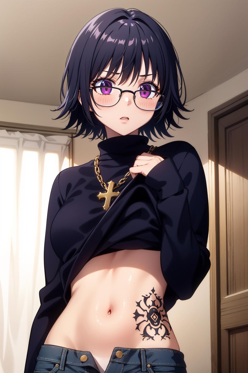 shizukuwz, glasses, pants, jeans, black hair, short hair, cross necklace, long sleeves, turtleneck, sweater, purple eyes, inverted cross