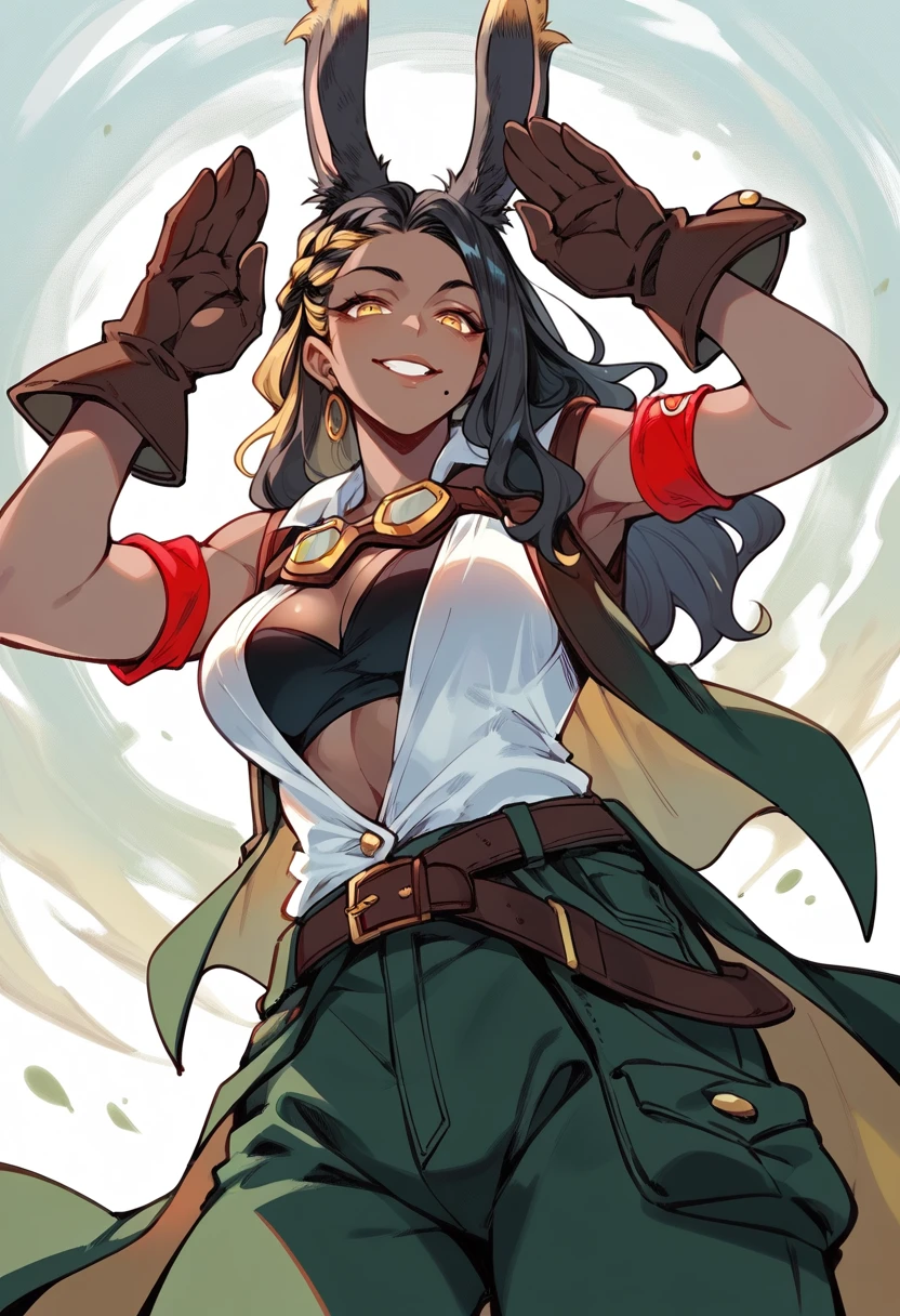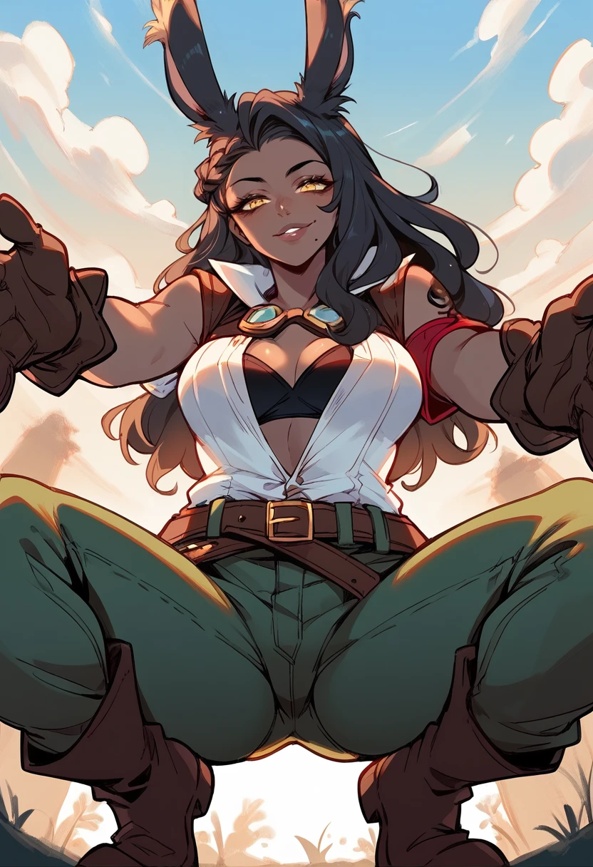 Outfit: "cahc1uadrip, belt, green pants, open clothes, red armband, brown gloves, goggles"