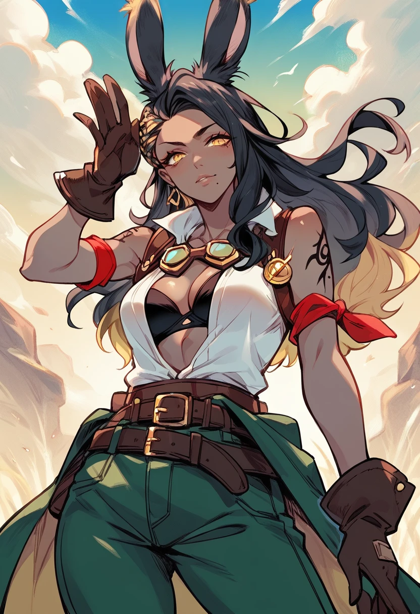 Trigger: "cahc1ua, long hair, mole under mouth, black hair, multicolored hair, braid, yellow eyes, viera, dark skin" always needed for accuracy.