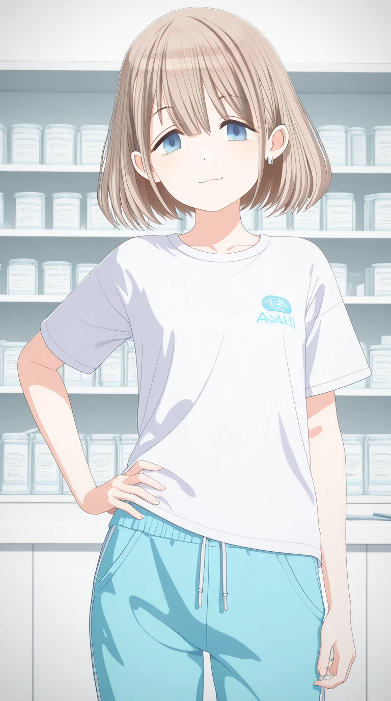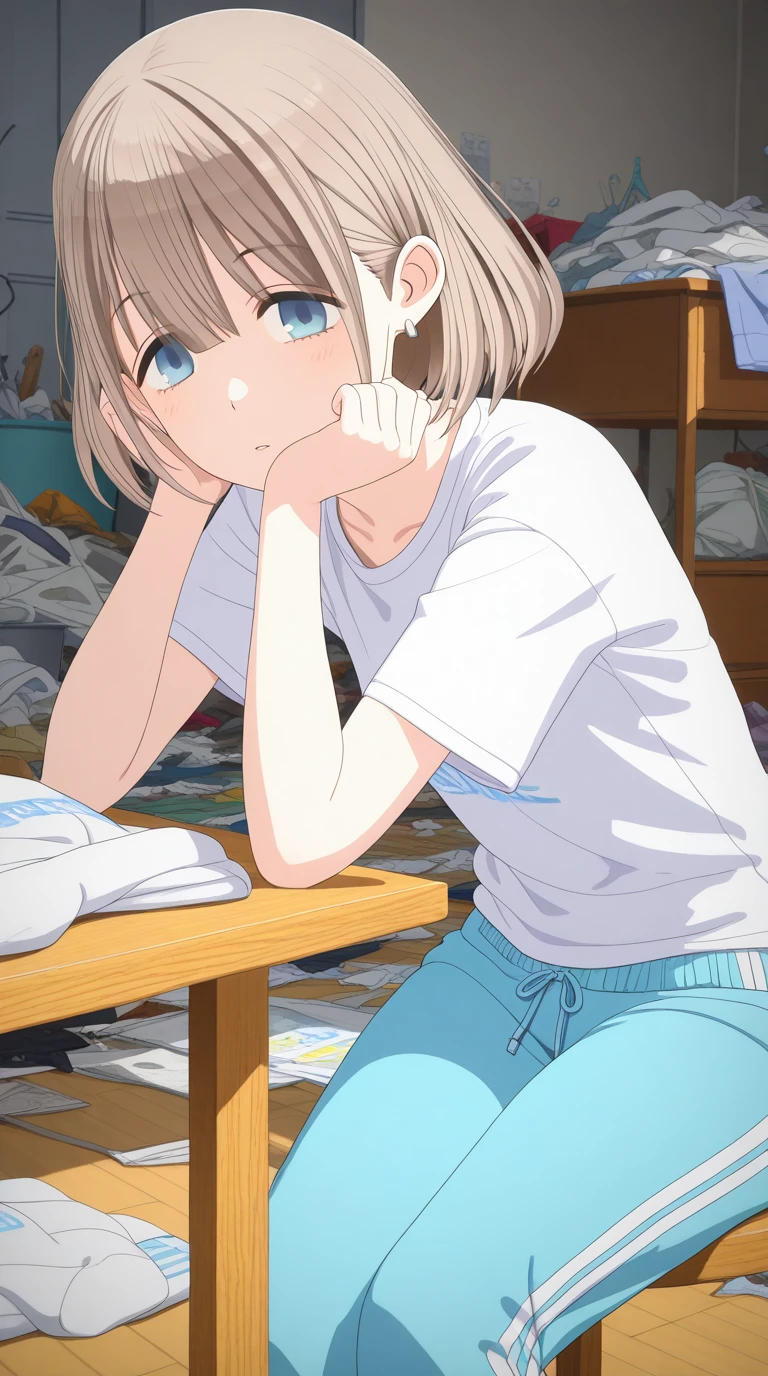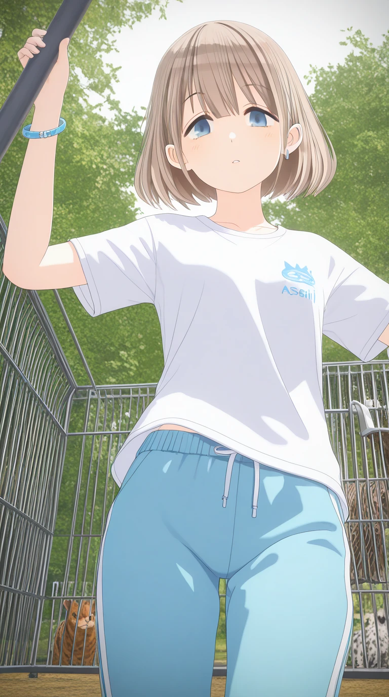 shirt, jewelry, white shirt, pants, t-shirt, blue pants, track pants, sweatpants,