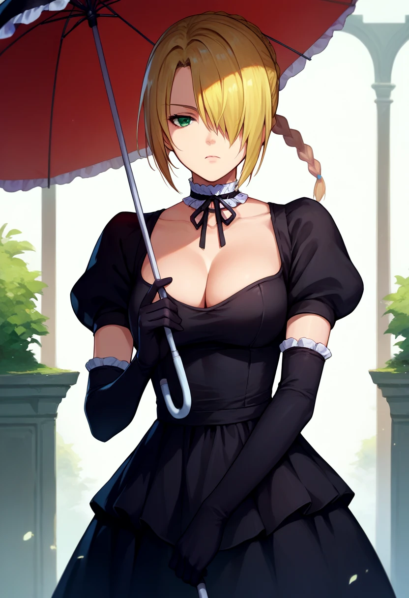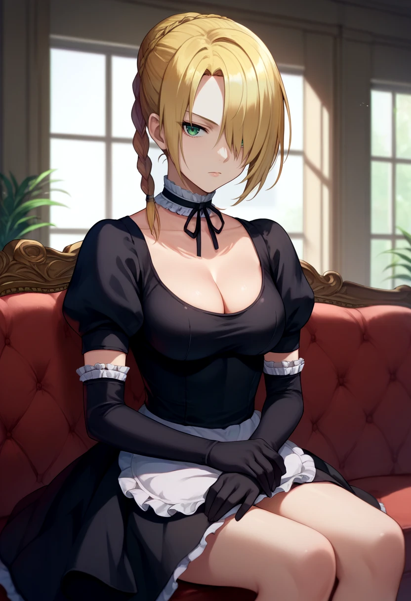 maid, black dress, black gloves, elbow gloves, frilled choker, cleavage