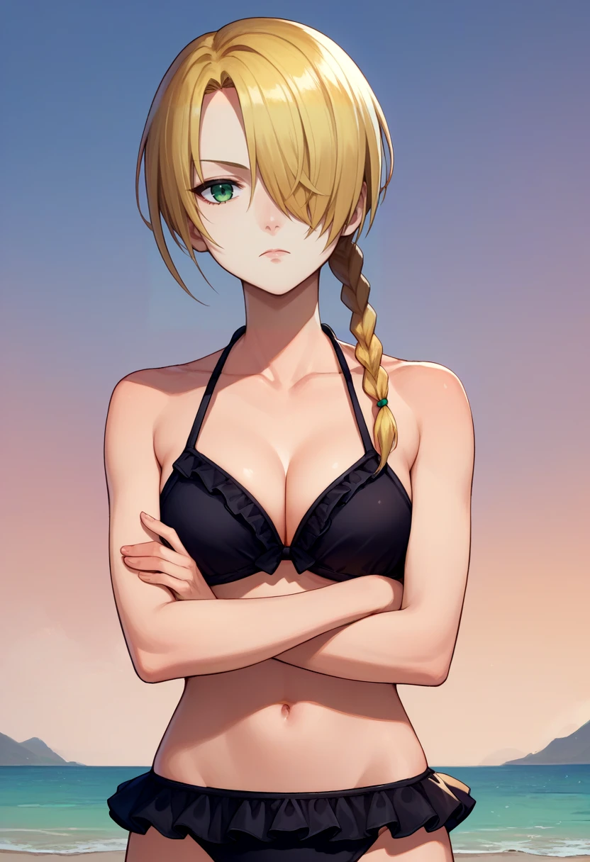 Trigger + Appearance: hildegarde, hair over one eye, braid