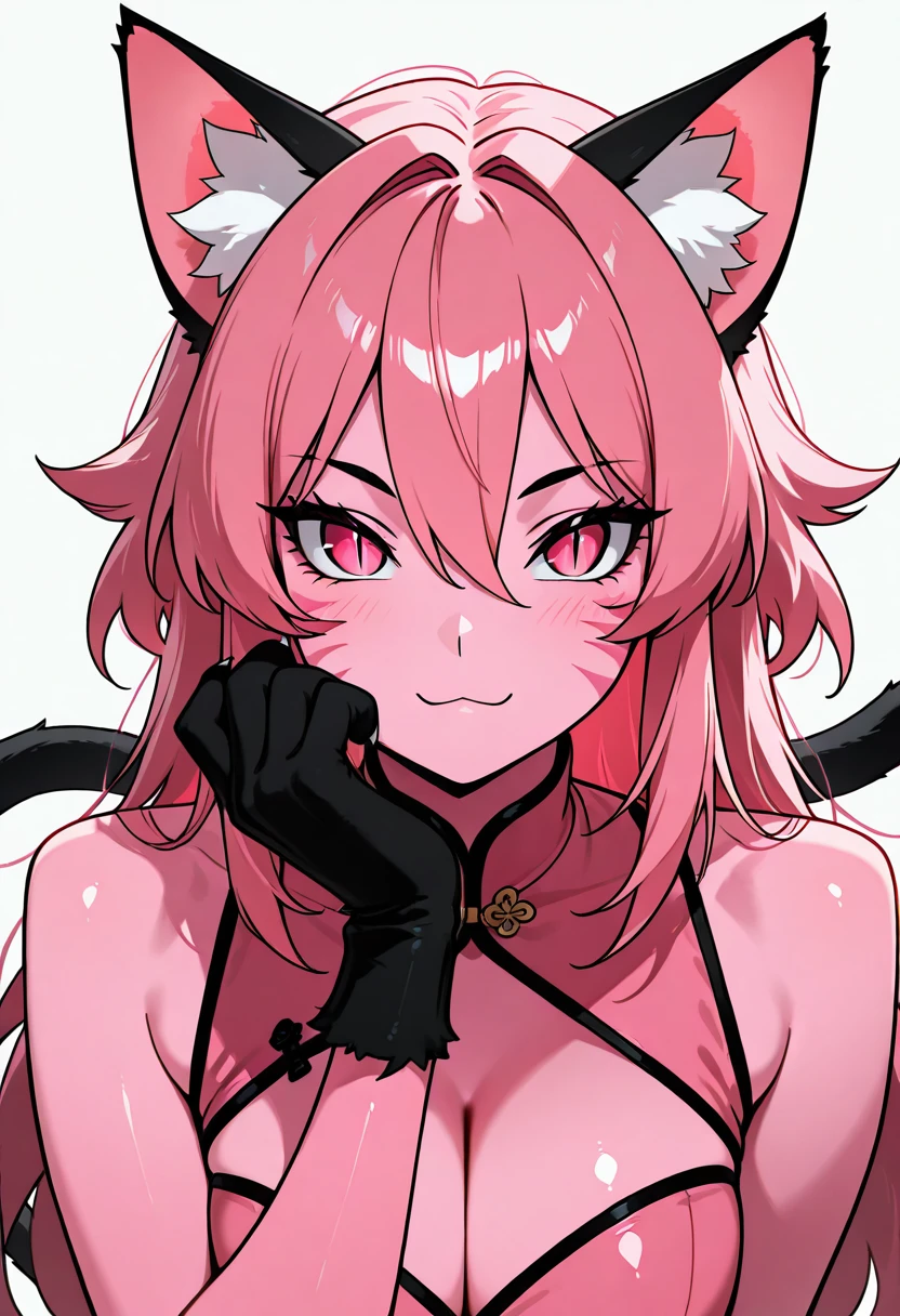 zzPinkit, pink eyes, long hair, pink hair, pink skin, colored skin, animal hands, hair between eyes, cat ears, animal ear fluff, cat girl, slit pupils, animal ears, whisker markings, black gloves, china dress, bare shoulders, tail, sleeveless,
