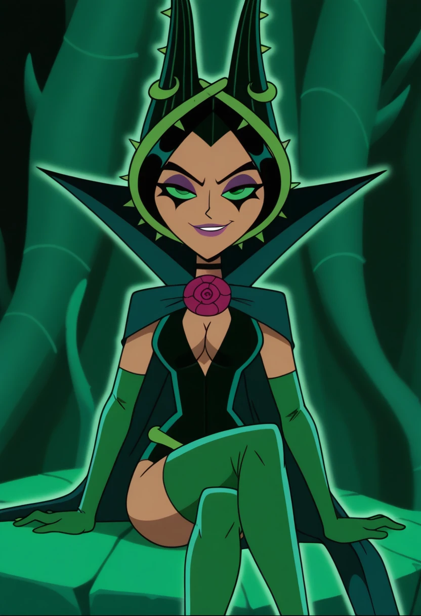 samuj2, 1girl, solo, blank eyes, green sclera, green , green thigh boots, rose brooch, dark green cape, horned headwear, bridal gloves, cleavage cutout