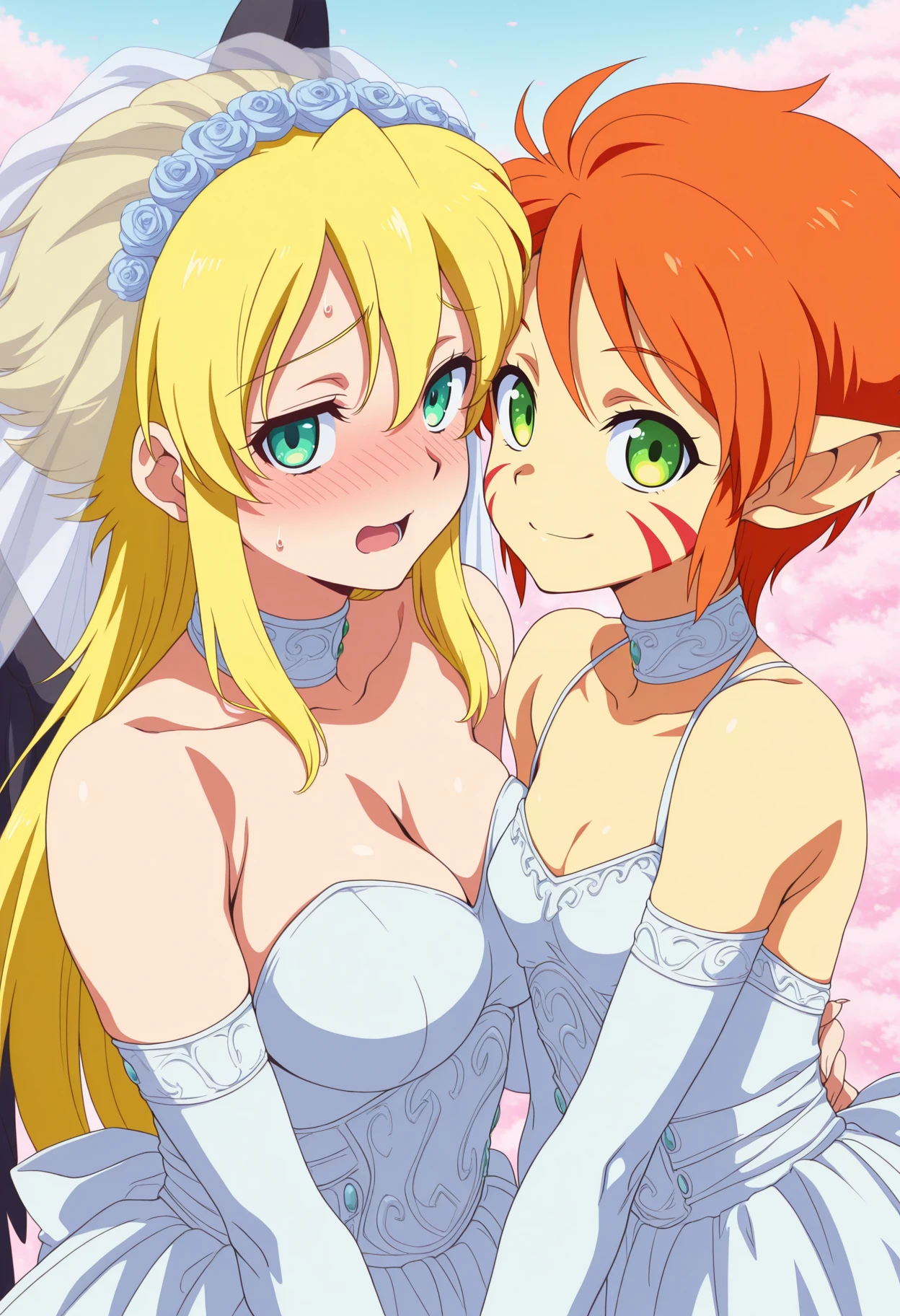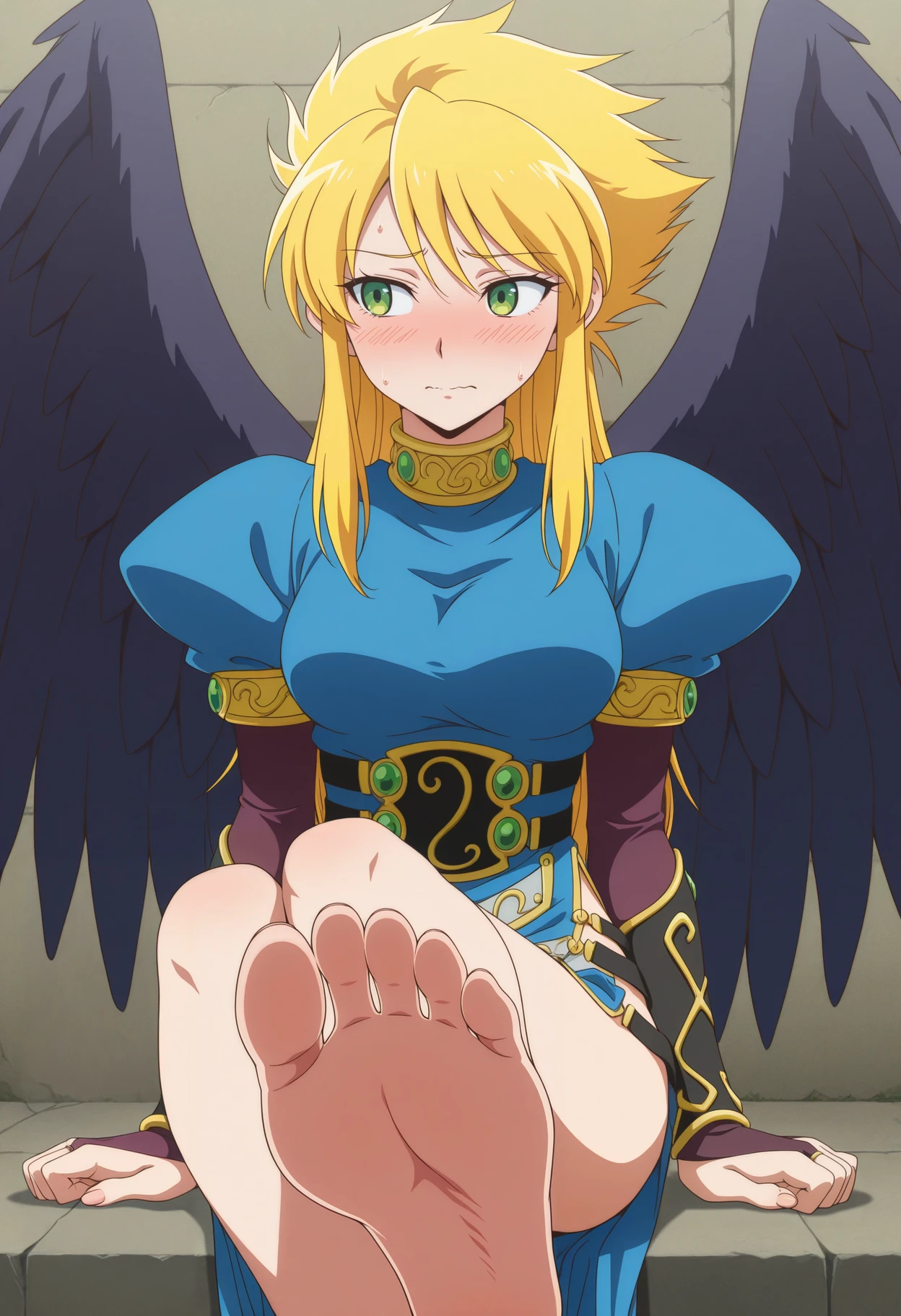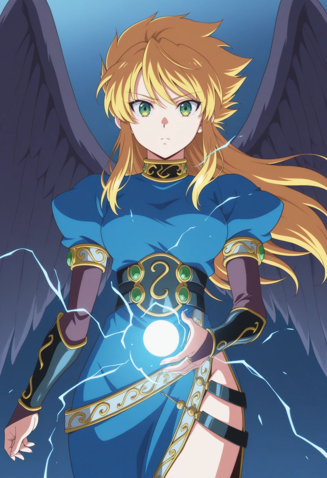 green eyes, blonde hair, long hair, sidelocks, wings, blue dress, side slit, belt, corset, high collar, armlet, short sleeves, bridal gauntlets, armored boots