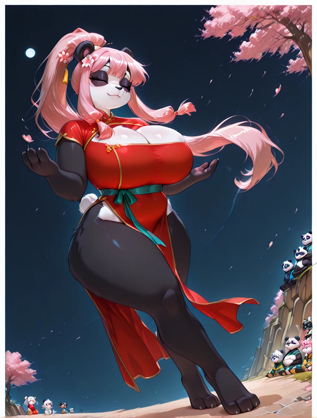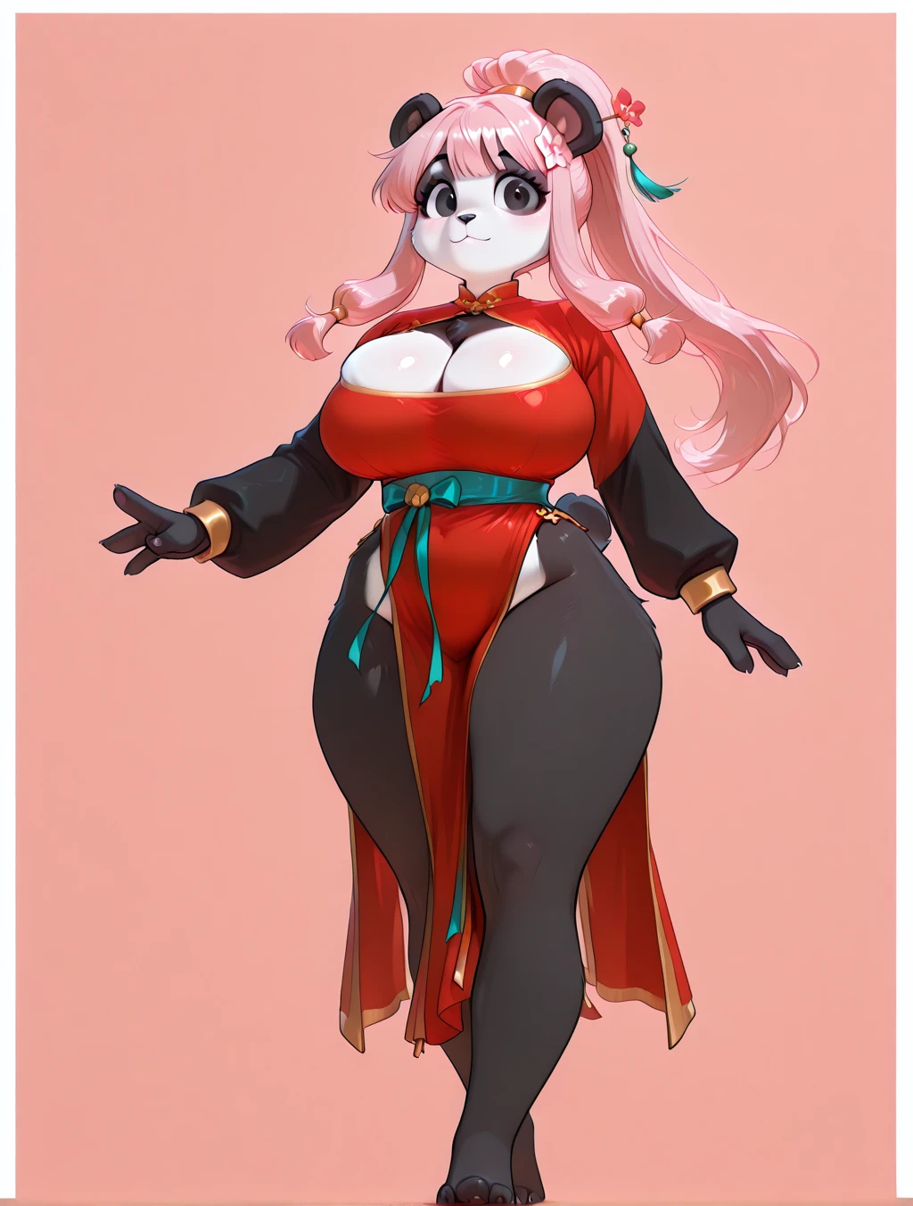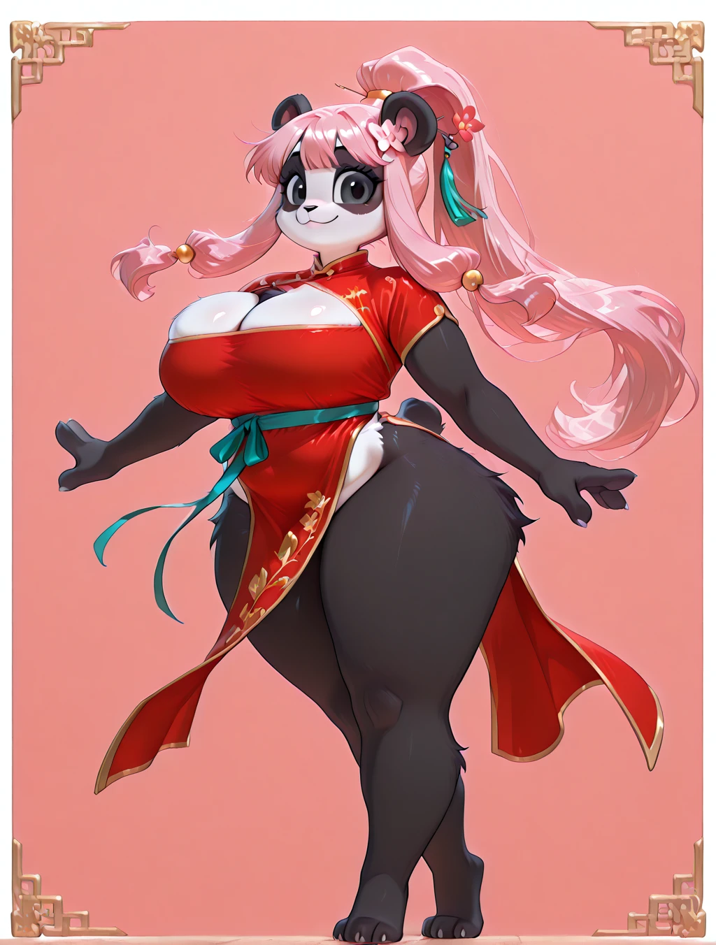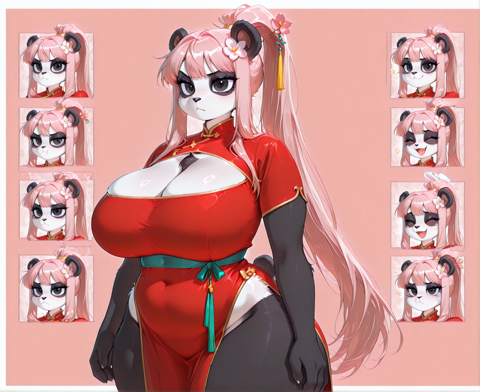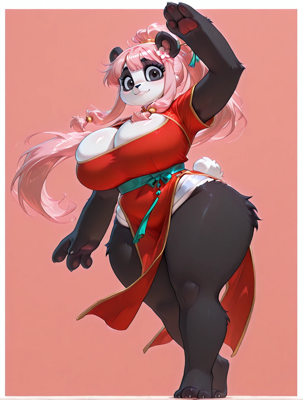(1girl, solo, 3 fingers, fewer digits, furry female, Panda, Panda girl, panda ears, panda tail, black fur, black skin, white skin, multicolored skin, two-toned skin, body fur, black fur, white fur, two-toned fur, pink hair, long hair, bangs, side-locks, ponytail, black eyes, fluffy body, glistening skin, mature female, voluptuous, big breasts, Chinese outfit, Hanfu clothing, flower hairpin, Yupei, Zhongyi, Ru, Xiuzi, Qun, Yaodai, Jiaoling, Gongtao, Yupei, cleavage cutout, hair ornament, red dress)