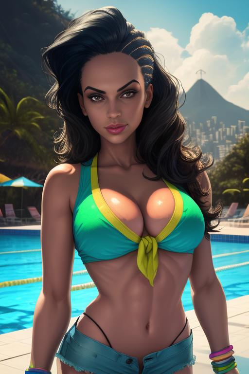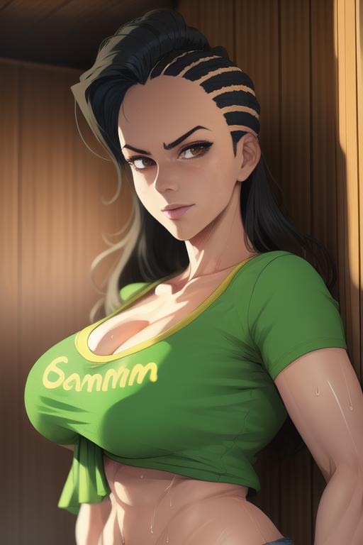 Other trigger words: green minishirt, denim minishorts, black thong, sandals, bracelets, bracelets2, choker, green tanktop, martial arts pants, black belt, green pants, shin guards (doesn't work well).