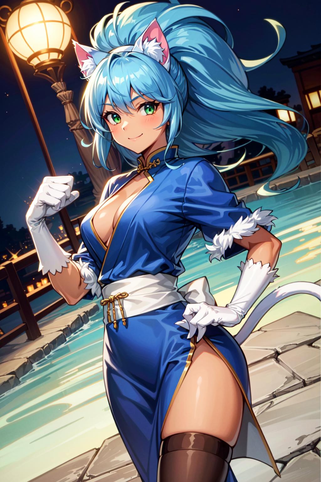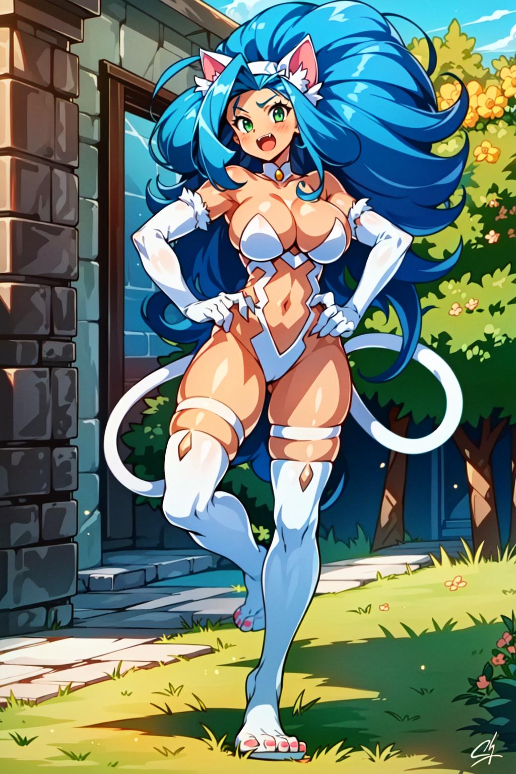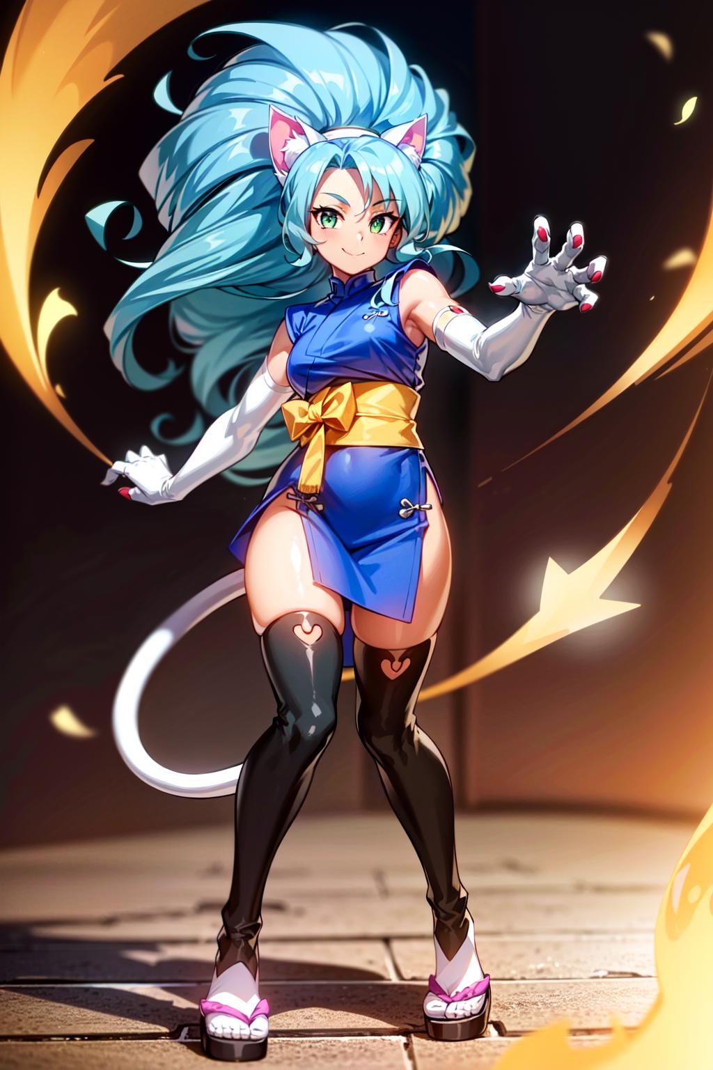 Felicia, 1girl, felicia (vampire), solo, animal ears, animal hands, tail, cat ears, blue hair, big hair, long hair, cat tail, breasts, claws, open mouth, hand on hip, fangs, full body, large breasts, fur, standing, signature, navel, cat girl, green eyes, mature woman