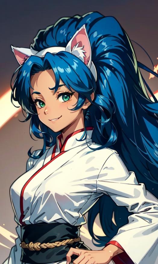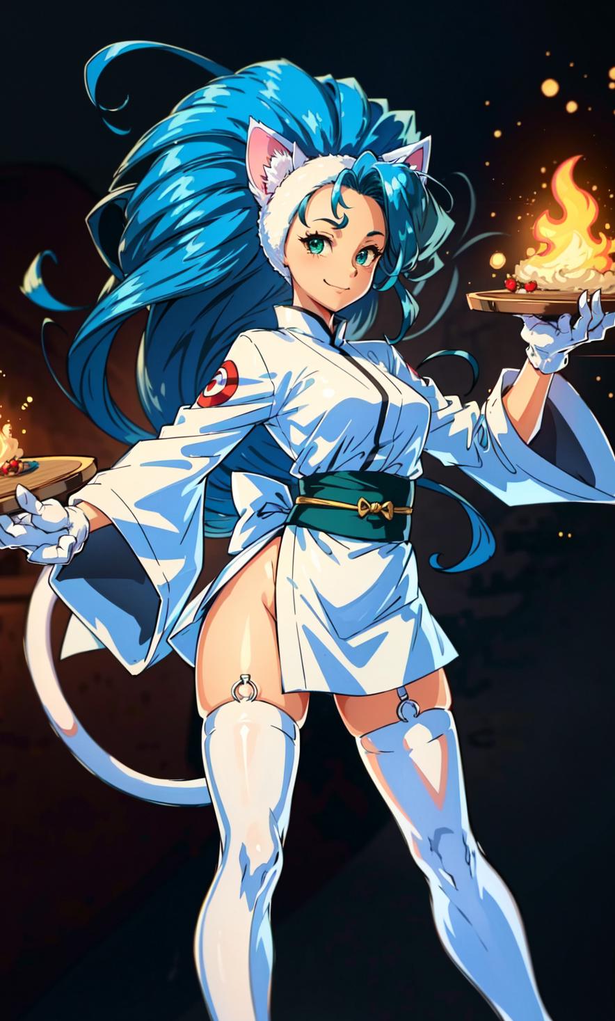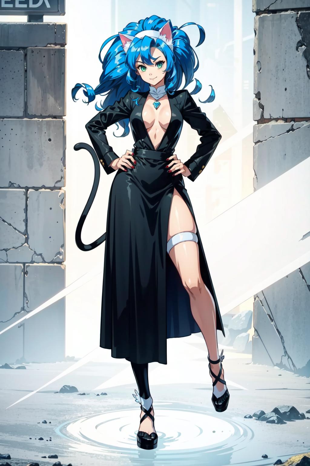 Felicia, 1girl, felicia (vampire), solo, animal ears, animal hands, tail, cat ears, blue hair, big hair, long hair, cat tail, breasts, claws, open mouth, hand on hip, fangs, full body, large breasts, fur, standing, signature, navel, cat girl, green eyes, mature woman