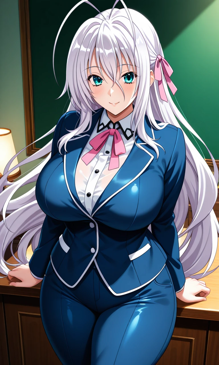 Rossweisse, white hair, antenna hair, long hair, very long hair, cyan eyes, breasts, large breasts, mature female, hair between eyes, hair ribbon, pink ribbon, Thighs, thick thighs,