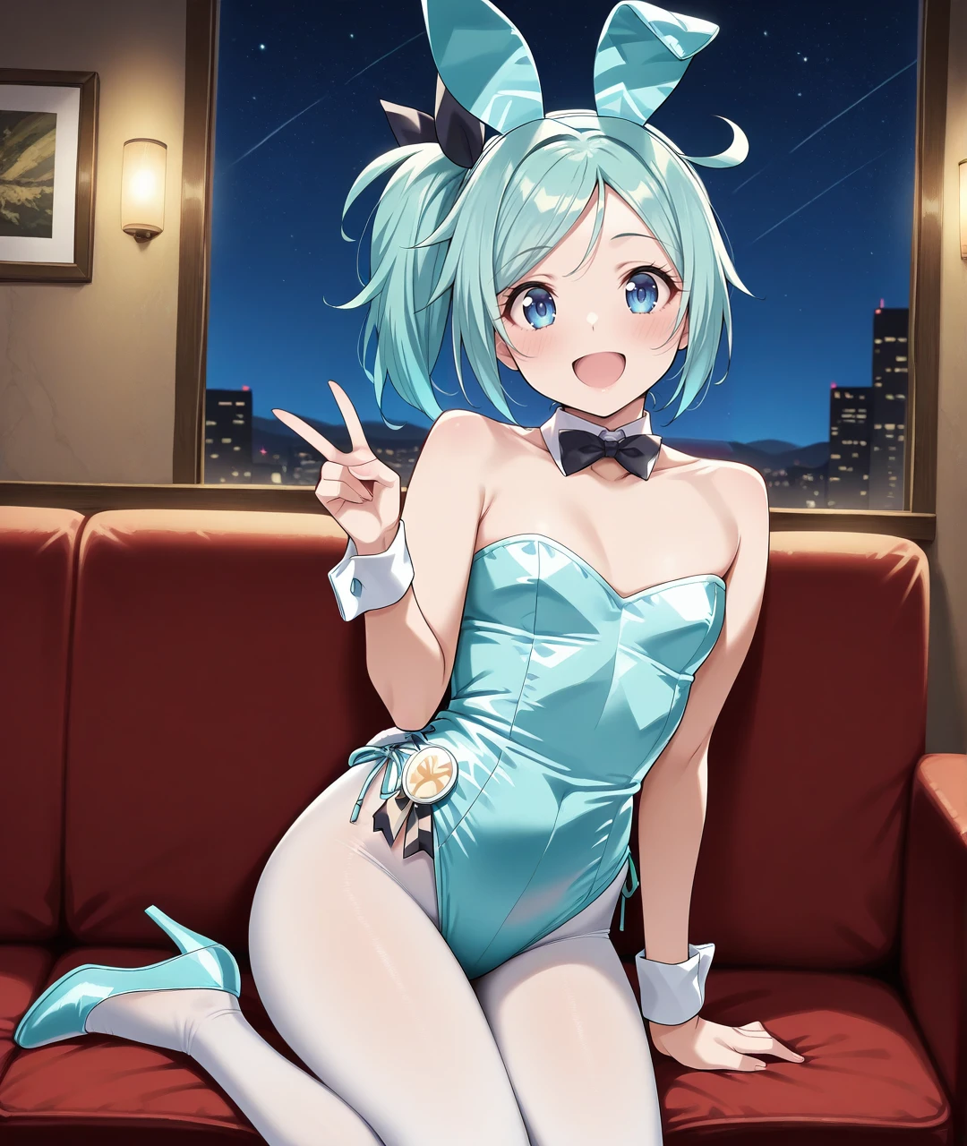 Tags: AlbBase, blue eyes, aqua hair, long hair, ahoge, high side ponytail, black hair ribbon, choker, wrist cuffs, ???? shoulders, collarbone, small ???????, short dress, two-tone dress, aqua dress, white dress, two-tone scarf, white scarf, aqua scarf, belt, ankle cuffs, brown flats,