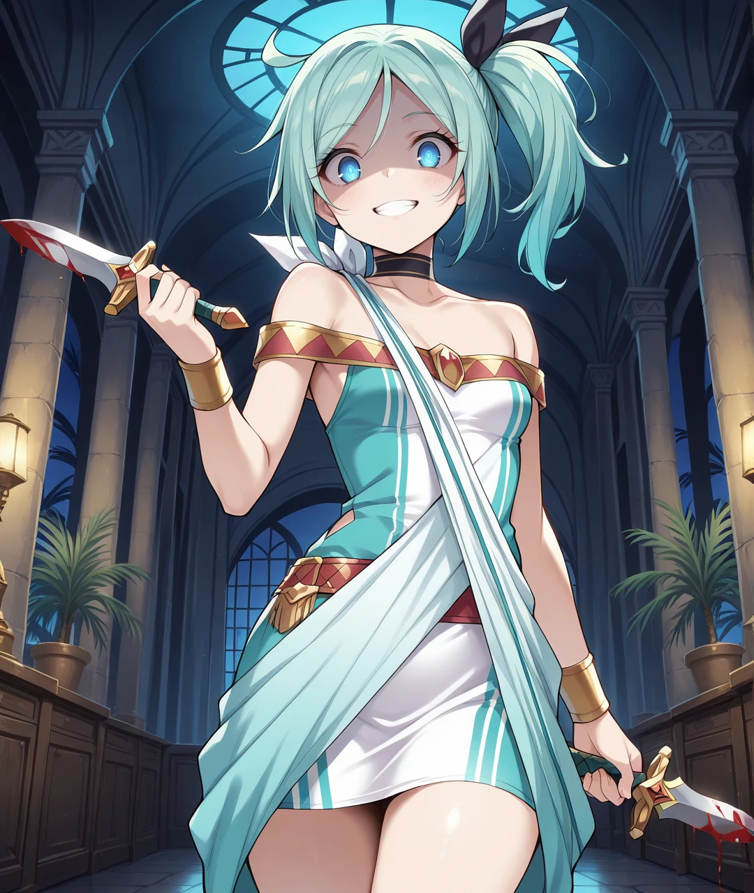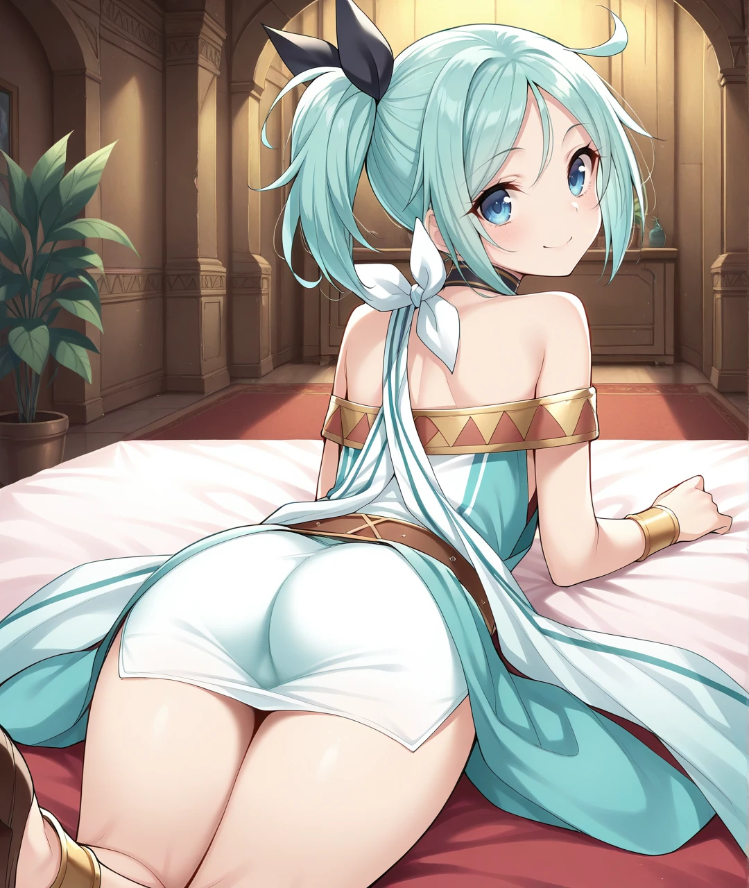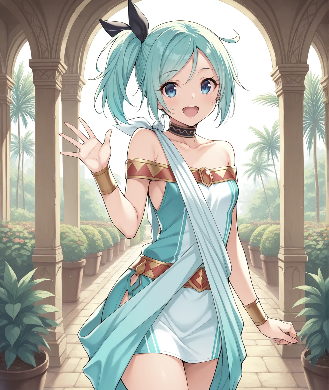 AlbBase, blue eyes, aqua hair, long hair, ahoge, high side ponytail, black hair ribbon, choker, wrist cuffs, bare shoulders, collarbone, small breasts, short dress, two-tone dress, aqua dress, white dress, two-tone scarf, white scarf, aqua scarf, belt, ankle cuffs, brown flats,