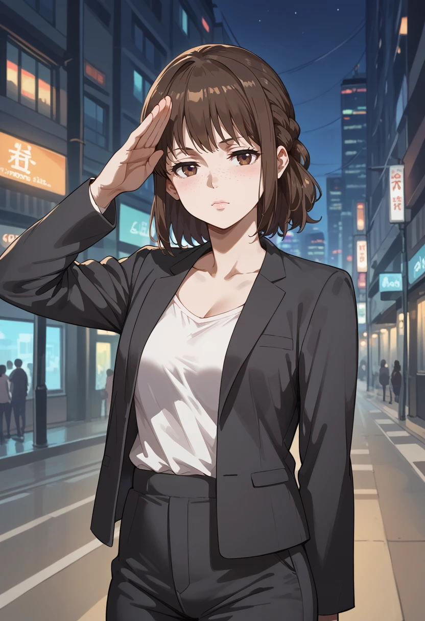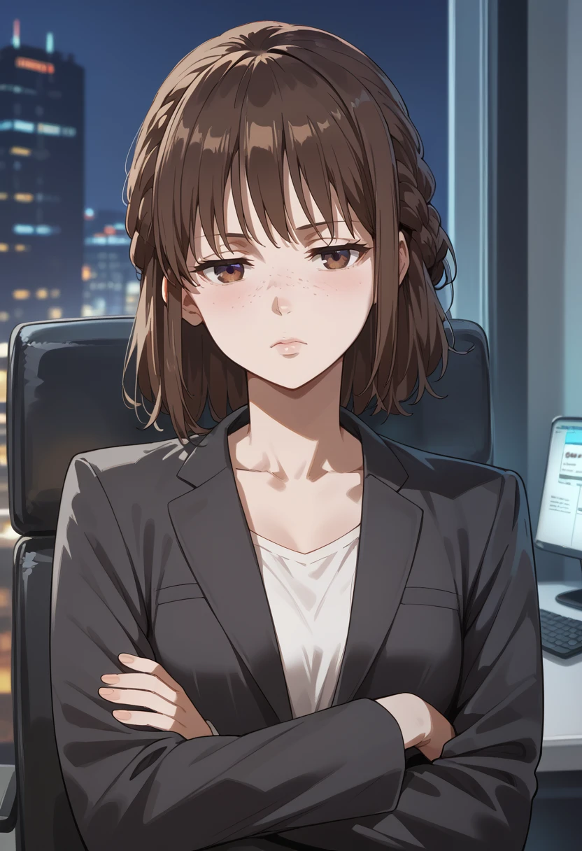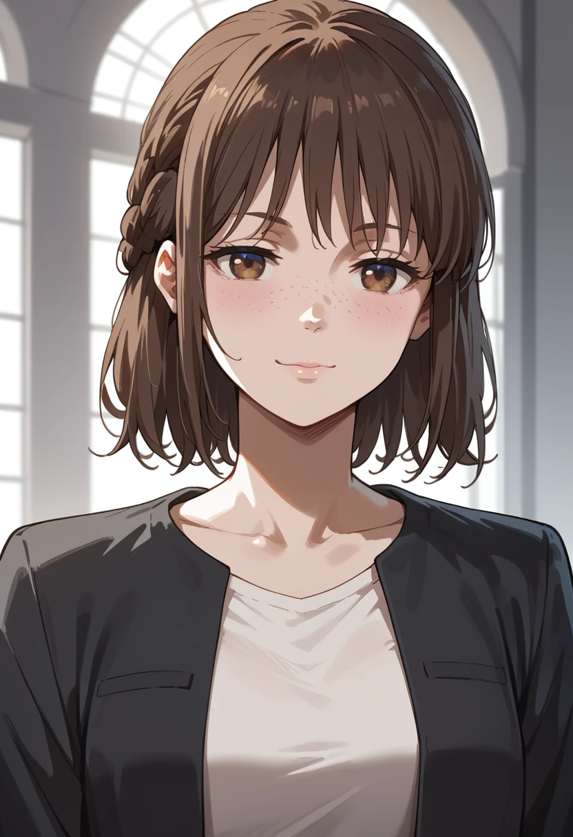 brown hair, brown eyes, medium hair, bangs, braid, freckles