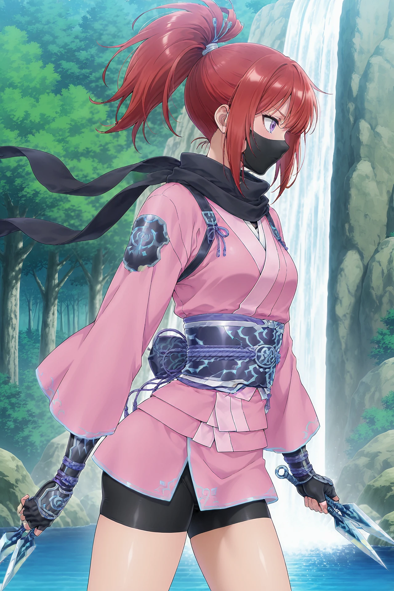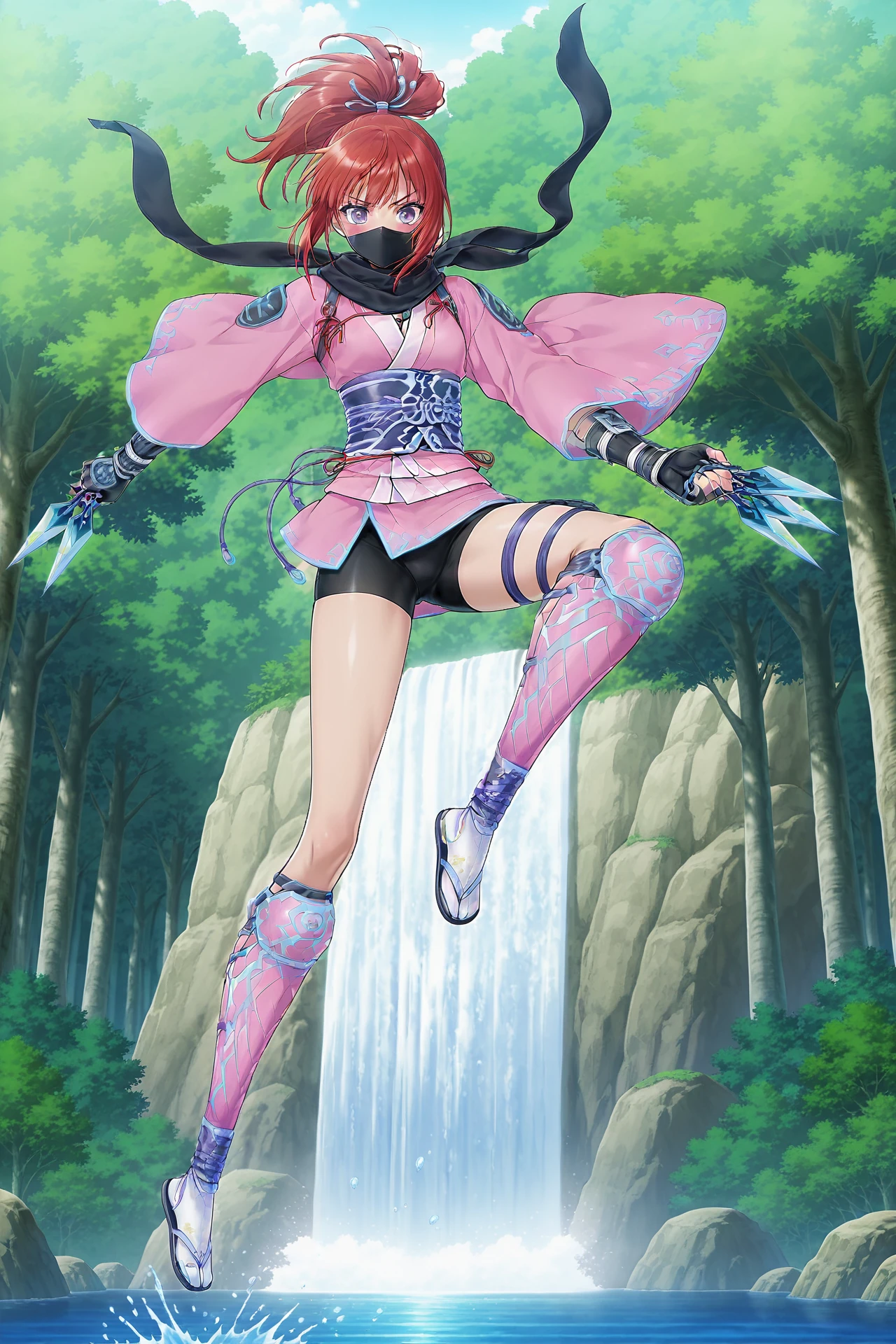 Secret_Six_Samurai_Hatsume, 1girl, solo, scarf, kunai, ninja, fingerless gloves, japanese clothes, mouth mask, bike shorts, ponytail, black scarf, purple eyes, red hair, ninja mask, sandals