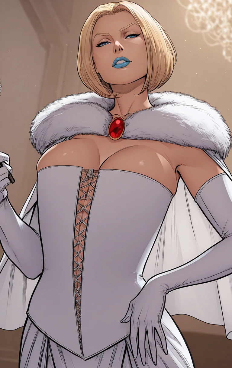 3mm4fc, 1girl, breasts, looking at viewer, short hair, blue eyes, large breasts, blonde hair, gloves, dress, cleavage, jewelry, medium breasts, collarbone, white gloves, parted lips, white dress, fur trim, off shoulder, lips, corset, fur collar, feather duster, full body, highleg, thigh boots, manicure, high heel boots,