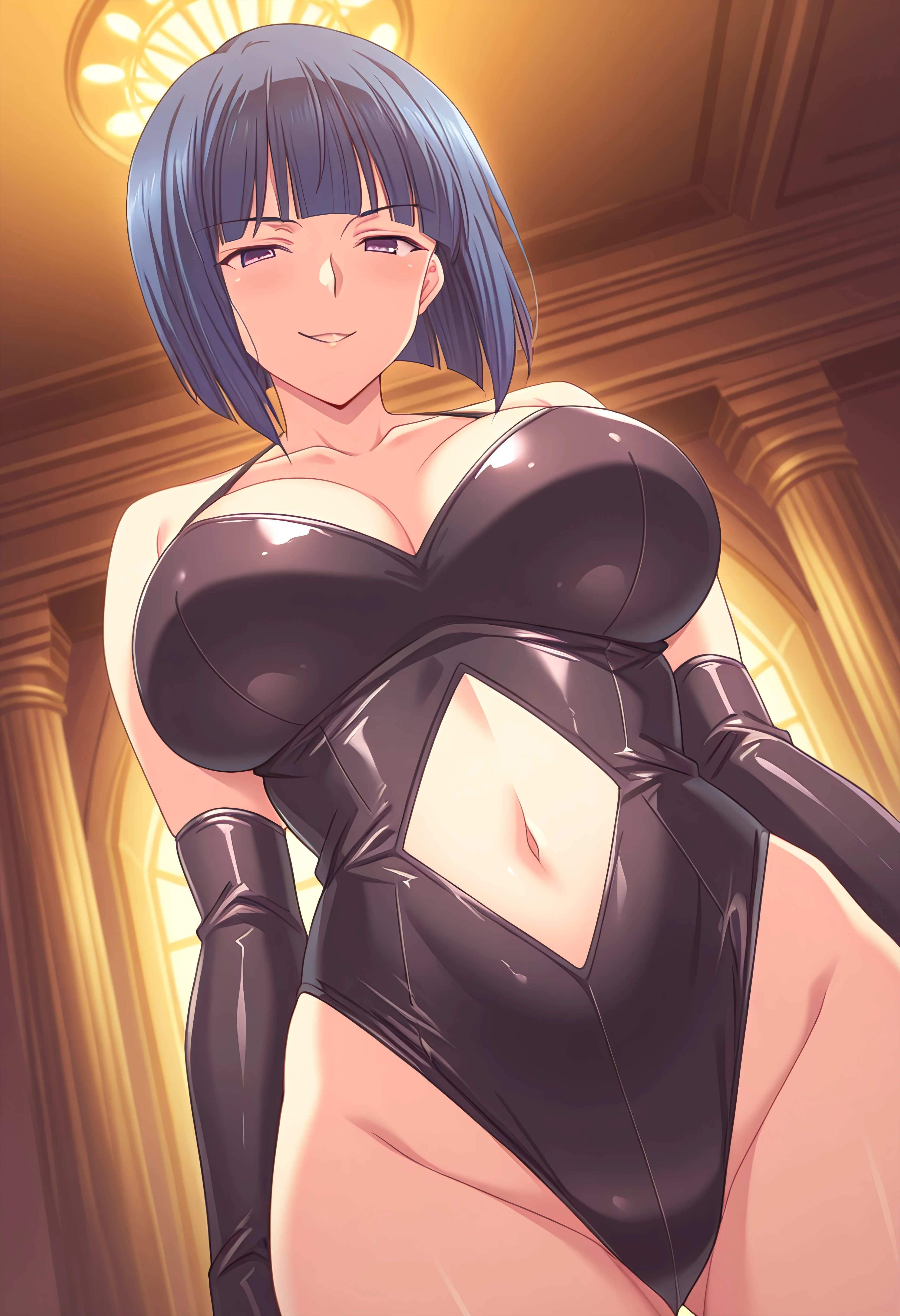 KawarazakiSachiko, blue hair, bob cut, blunt bangs, violet eyes, black elbow gloves, black leotard midriff navel cutout, latex, collarbone, neckline
