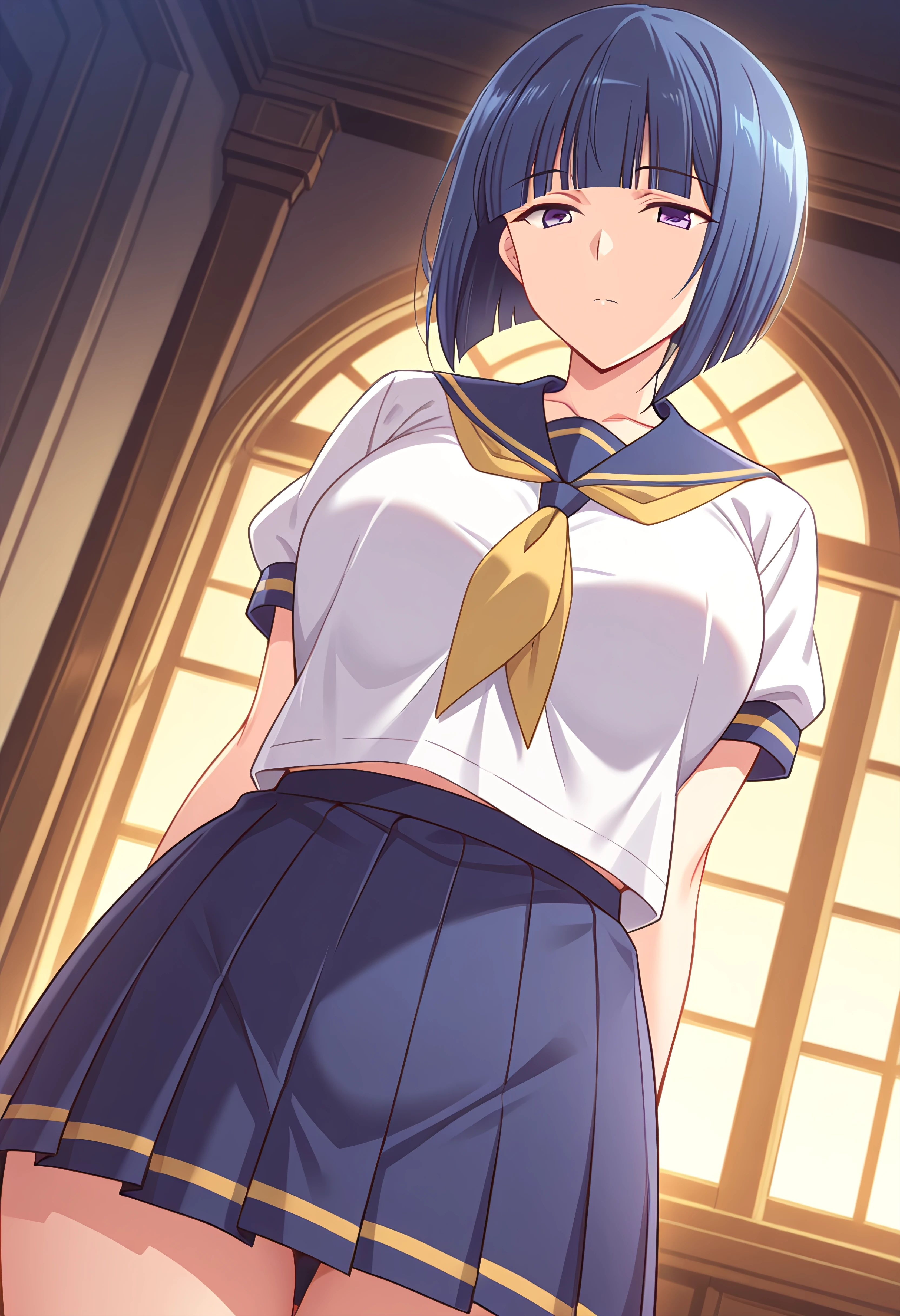 KawarazakiSachiko, blue hair, bob cut, blunt bangs, violet eyes, japanese sailor school uniform, blue sailor collar with yellow trim, yellow neckerchief tie, blue pleated skirt, socks, brown loafers