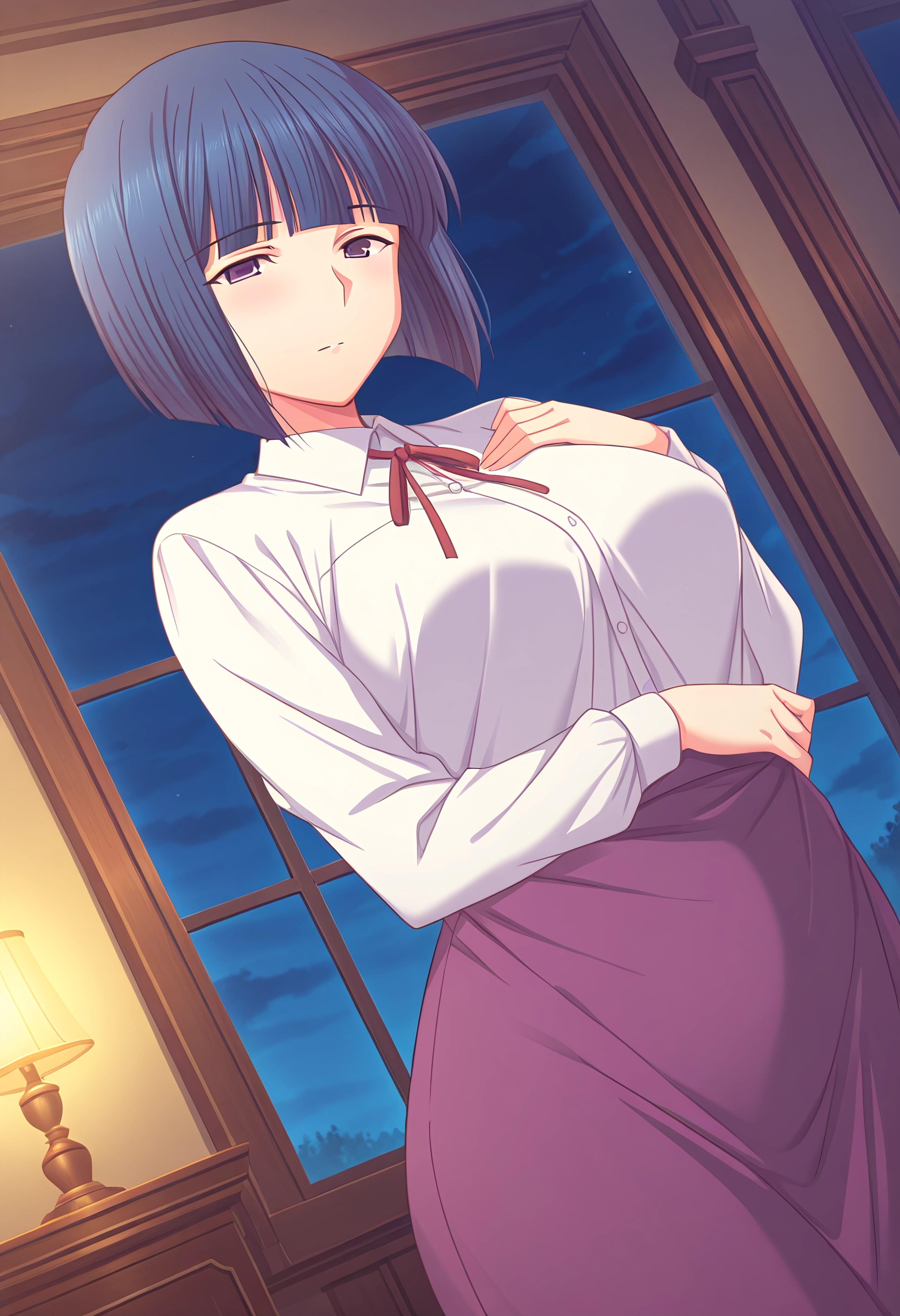 KawarazakiSachiko, blue hair, bob cut, blunt bangs, violet eyes, high-waisted purple skirt, white shirt with collar, thin string red ribbon bow tie, long sleeves