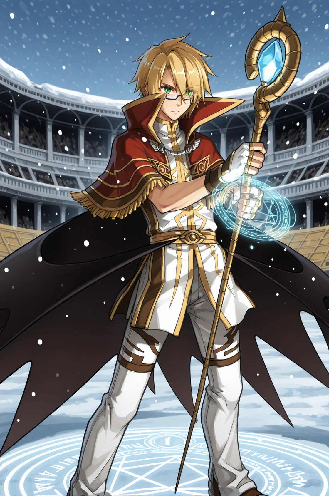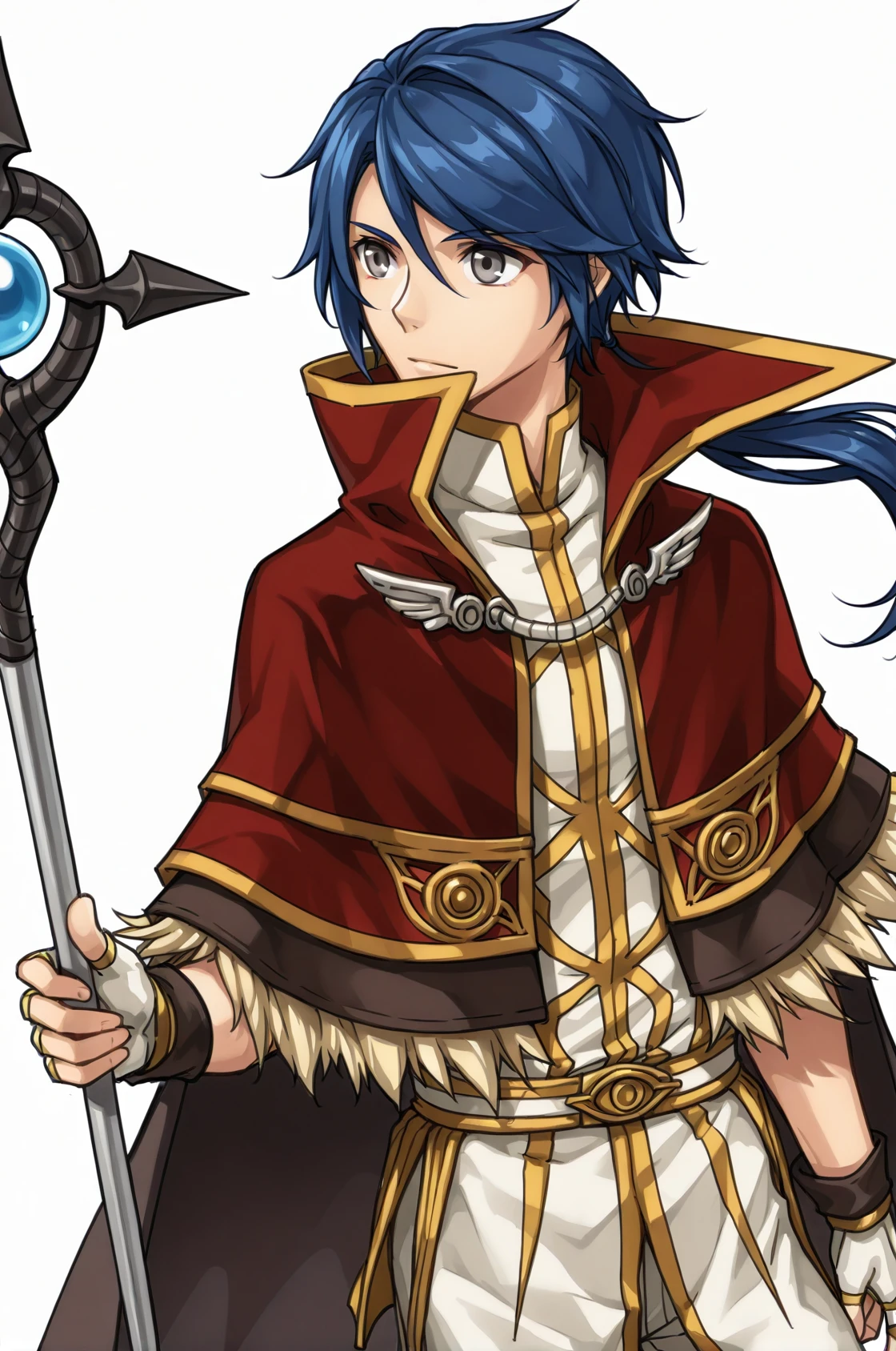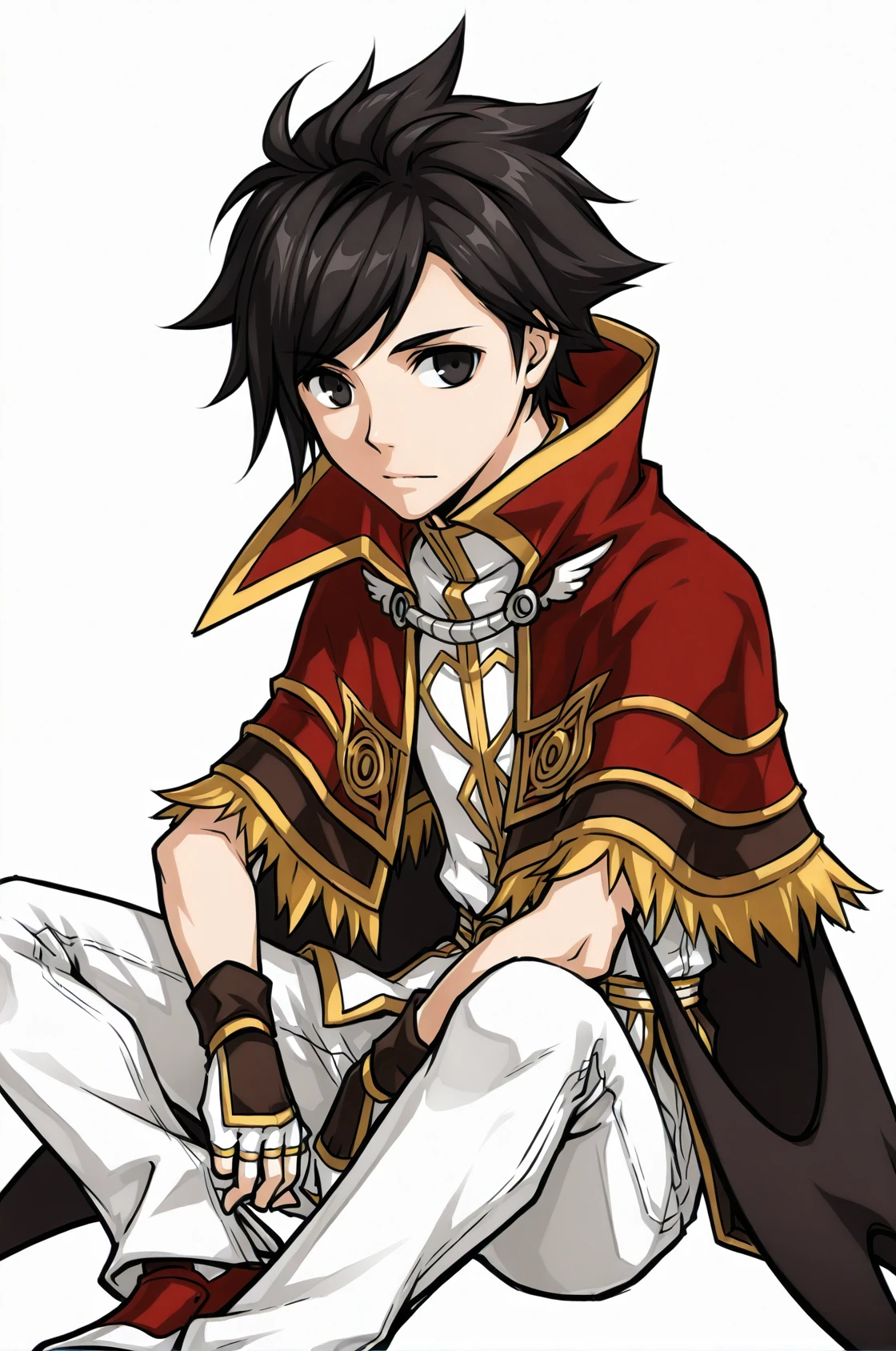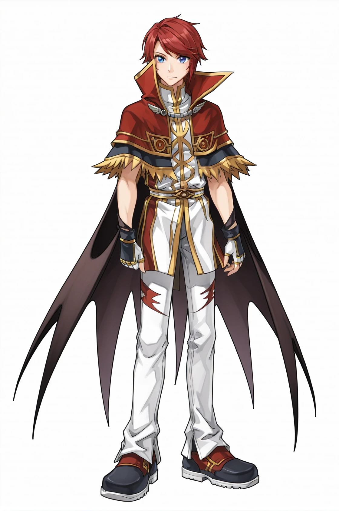 prompt: HiWizROMale, white shirt, high collar, sleeveless shirt, fingerless gloves, cape, capelet, wings, belt, white pants, shoes