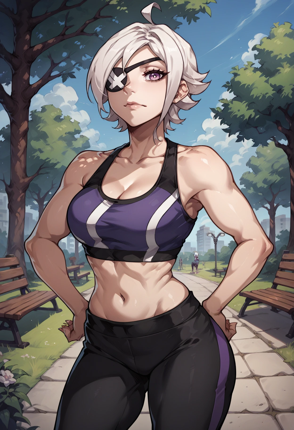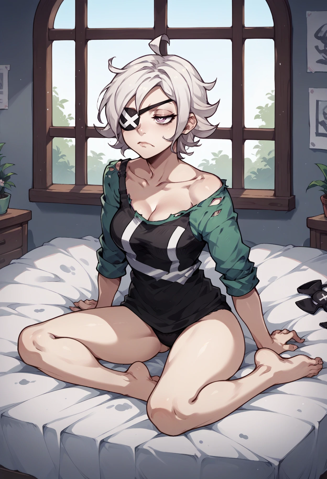 Default appearance: tara, white hair, short hair, ahoge, lavender eyes, eyepatch, collar, black pinafore dress, green shirt, puffy short sleeves, black gloves, brown belt, belt pouch, frills